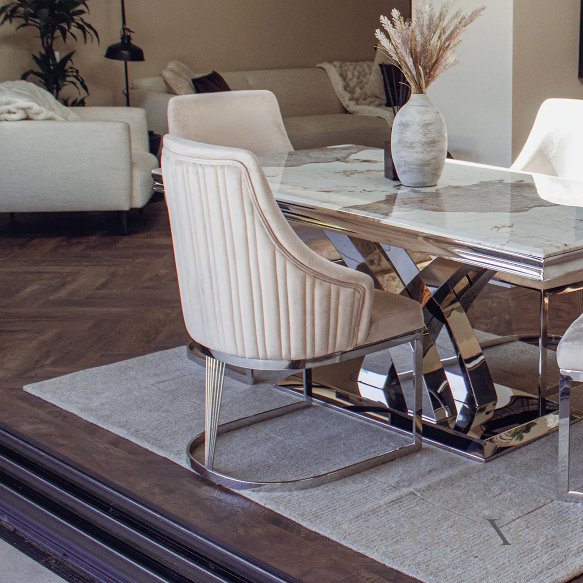 The Olivia Velvet Dining Chair makes a bold modern statement with its luxurious vertical fluted back design and gleaming chrome stainless steel frame. Upholstered in plush velvet, Olivia blends comfort, elegance, and a sleek, contemporary aesthetic. Aluxo-Track Aluxo-TrackCopy