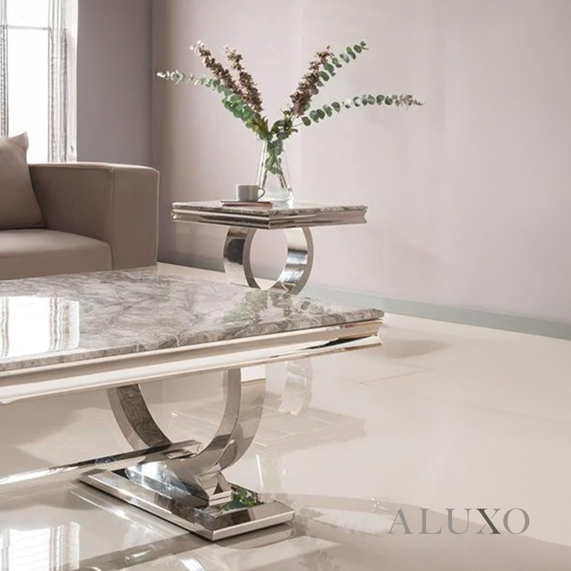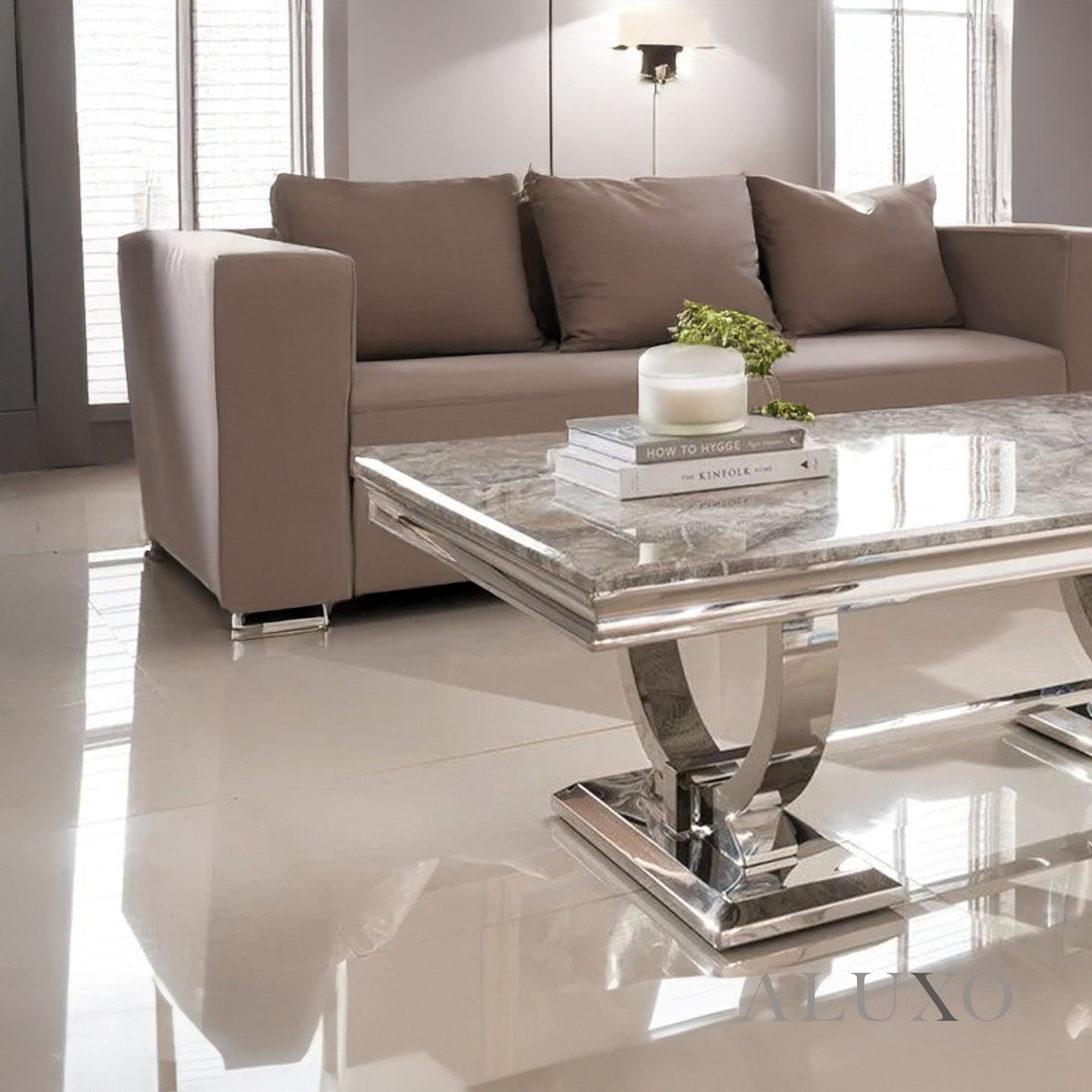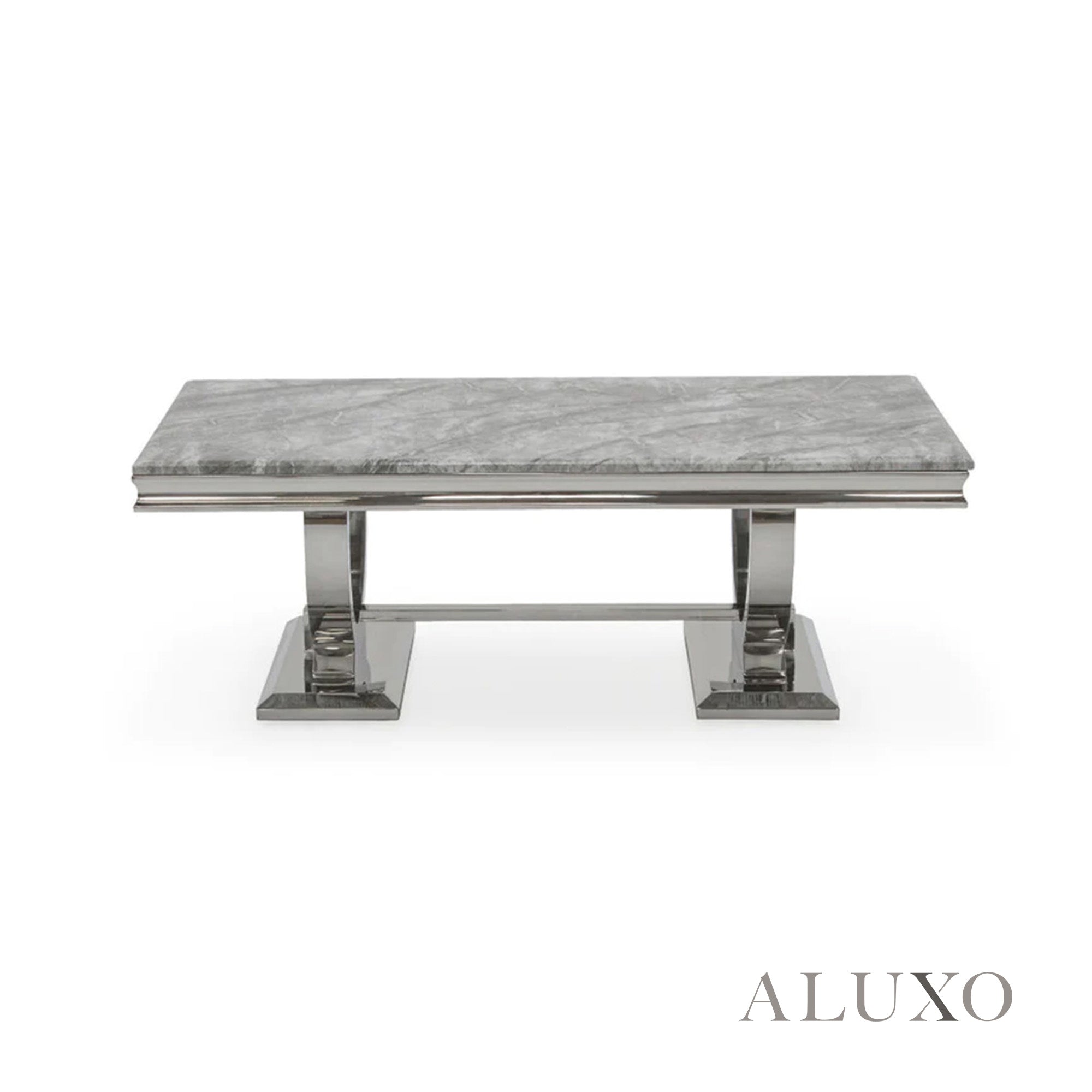 Elevate your living room with the Orvar 130cm Chrome Coffee Table, designed with a sleek rectangular silhouette and a luxurious grey marble-effect top. The polished double half-ring (U-stand) pedestal base ensures a striking aesthetic while providing unmatched stability. Aluxo-Track:AkselChromeGreyMarble