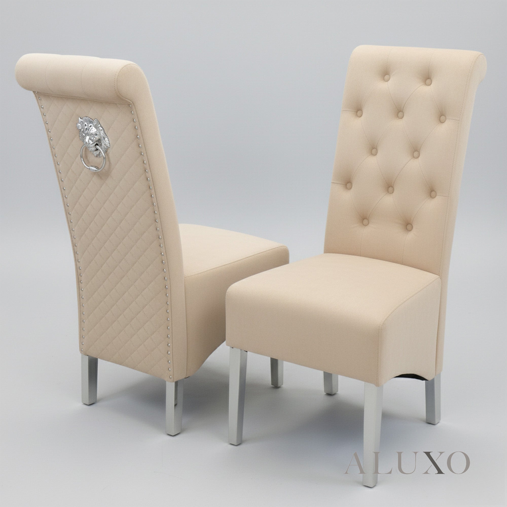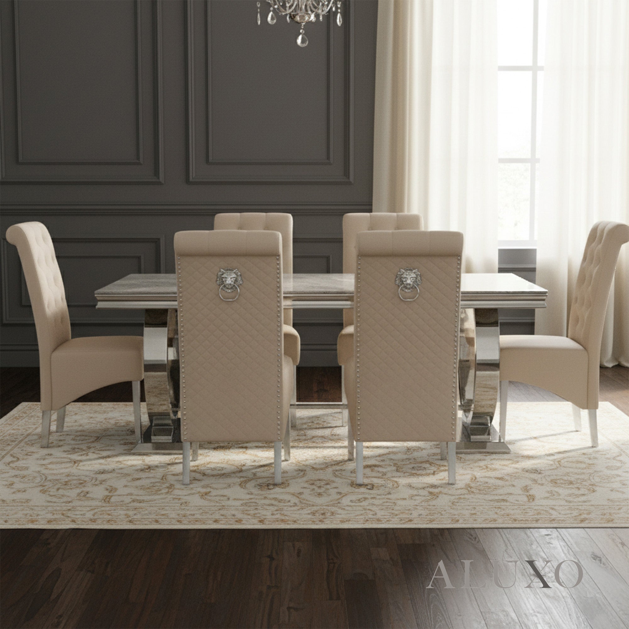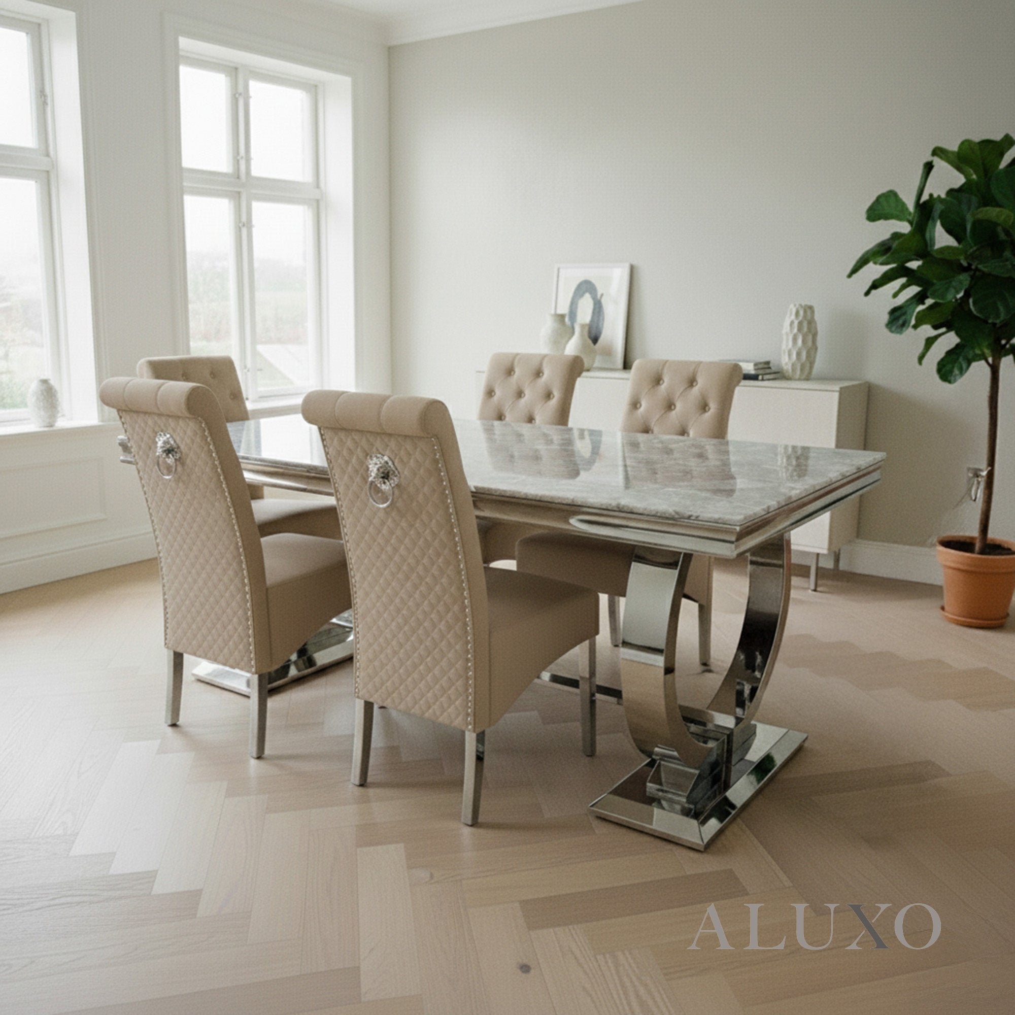 Introducing the Orvar 1.8m Marble Dining Table, a true centrepiece designed for contemporary living. The light grey marble laminate tabletop (15–25mm) features natural mid-grey veining, perfectly balancing elegance and durability. Its striking chrome double O stand base delivers a modern statement, while the sleek lines and polished finish make it easy to wipe clean—ideal for busy family homes. Paired with Einar Cream Velvet Lion Knocker Chairs, upholstered in plush velvet with quilted stitching, button stud detailing and chrome legs, this dining set combines glamour with everyday functionality.