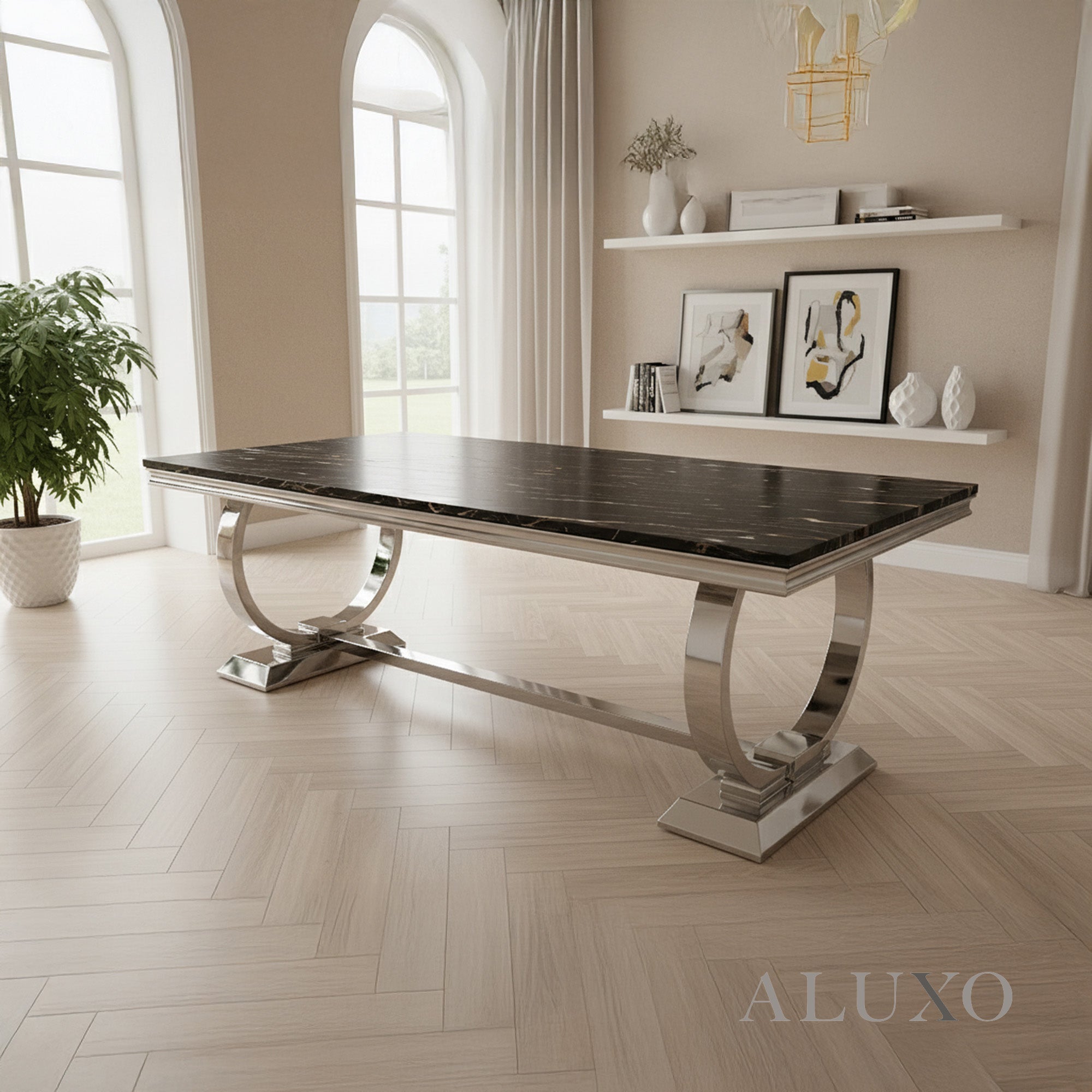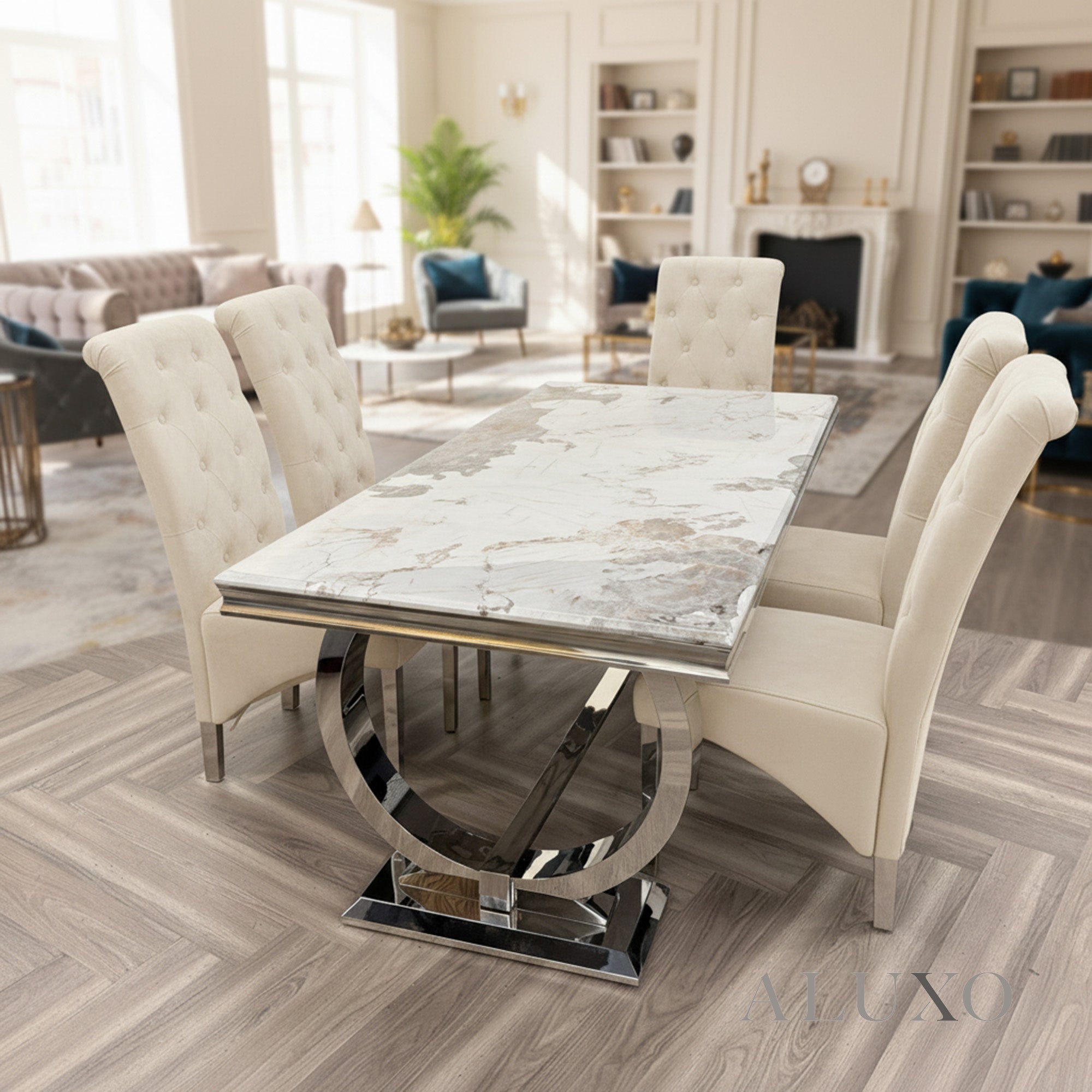 The Orvar 180cm Rectangular Marble Dining Table is an ultra-stylish centrepiece with a distinctive chrome double ring O base, designed to bring luxury and presence into your dining room. Perfectly sized for 6 people, it’s ideal for medium families or entertaining guests. ORV-180-Track:UK-01