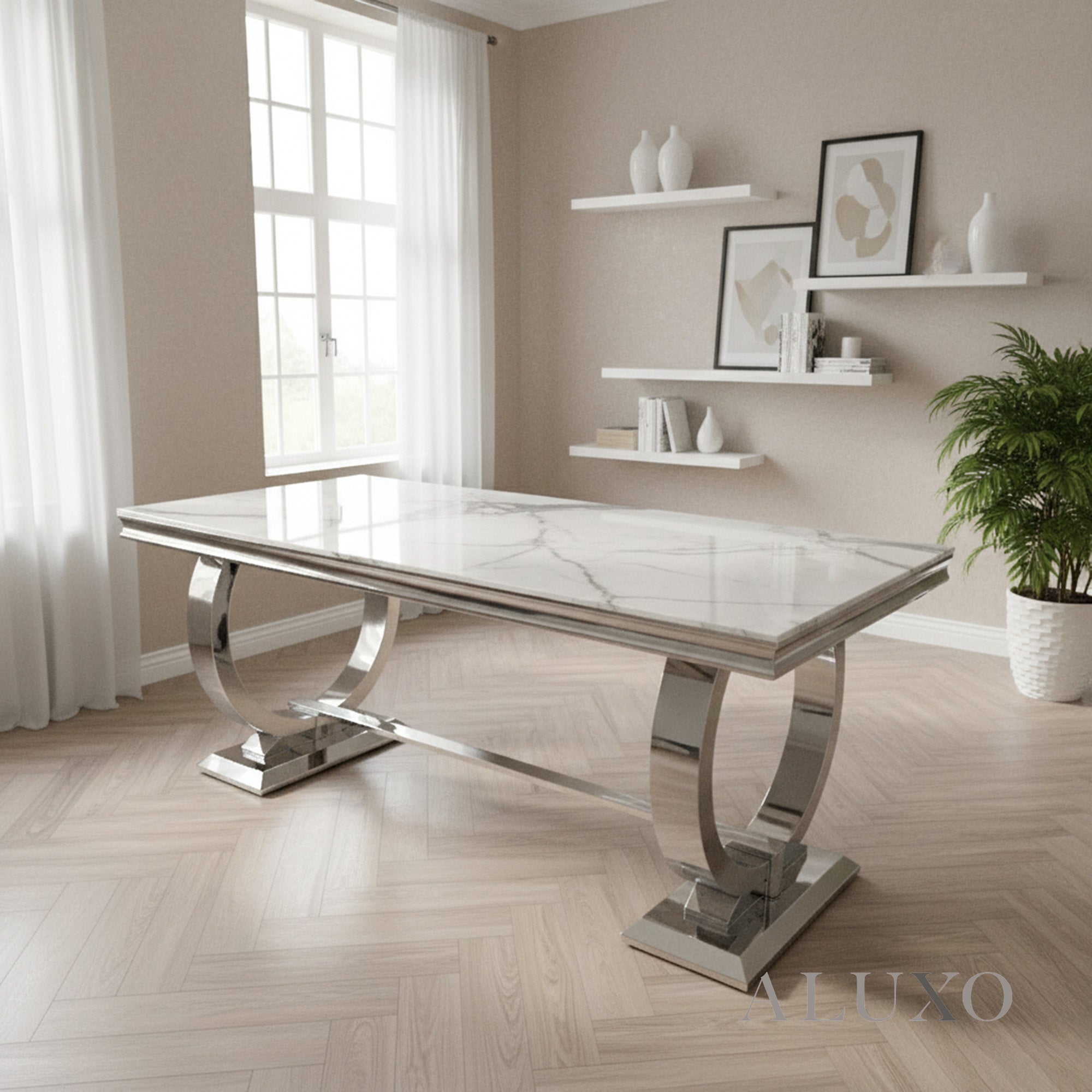 The Orvar 180cm White Marble Dining Table with Chrome O-Ring Base & 4/6/8 Bentley Chairs is the ultimate statement set for a modern dining room. With its sleek rectangular shape and durable marble-effect top, itβs perfect for medium to large families. ORV-180-SET-MULTI-UK01