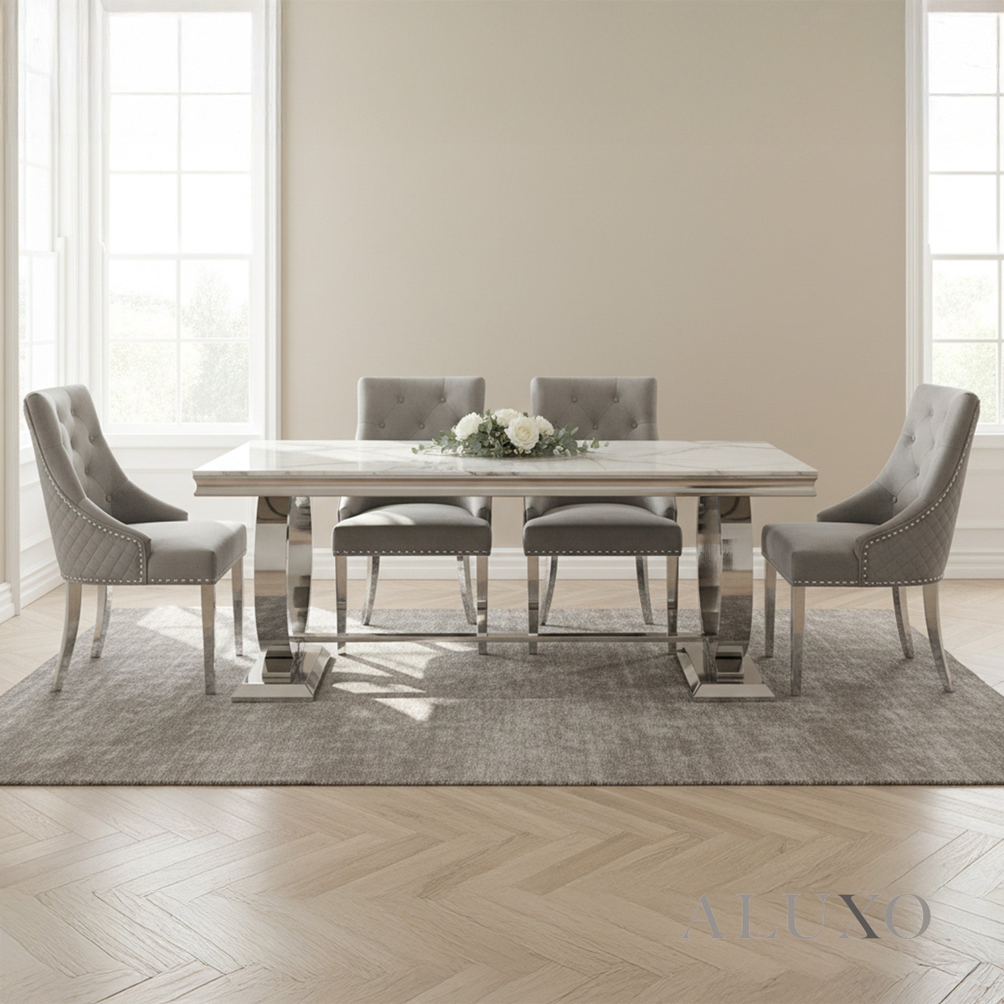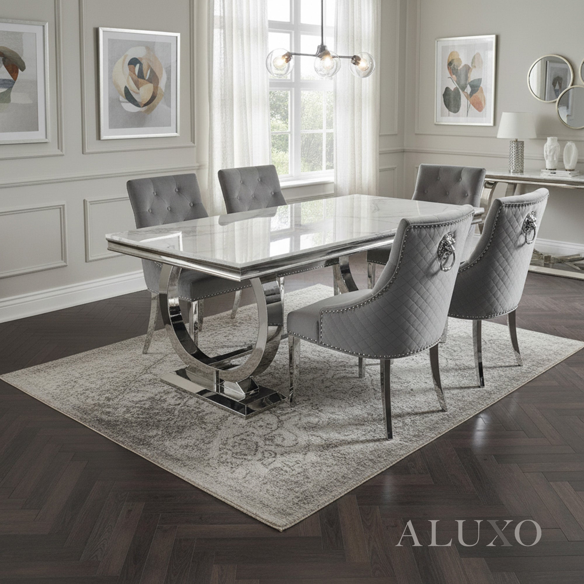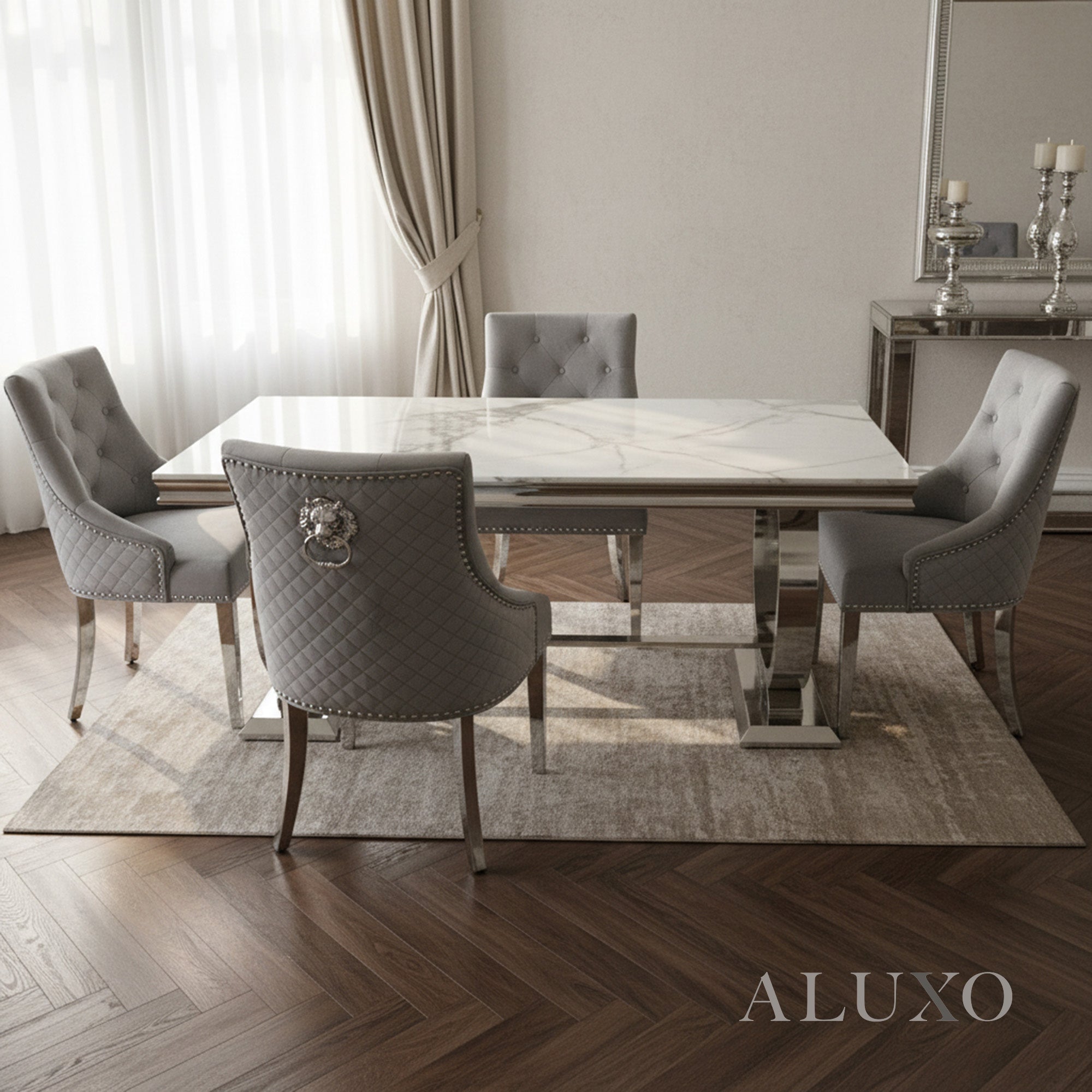 Paired with Grey black velvet dining chairs, featuring quilted stitching, stud detailing, and a chrome lion knocker back, this set perfectly balances style and functionality while being UK fire-resistant tested. ORV-180-SET-MULTI-UK03