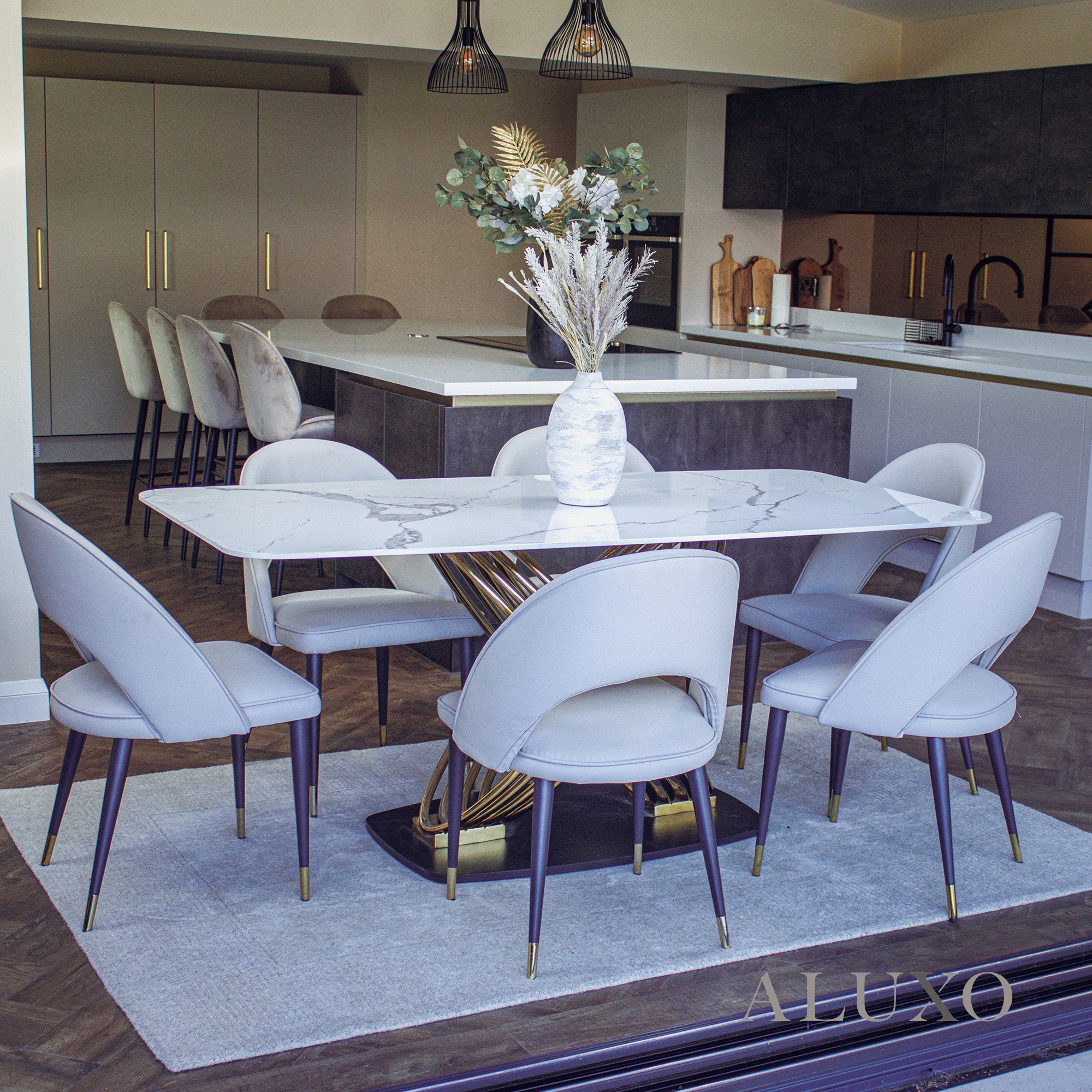 Featuring a 10mm Polar White sintered stone tabletop, this dining table is exceptionally hard-wearing, scratch-resistant, and easy to maintain. The bold pedestal base design offers unique silhouettes from every angle. OST-180-Key:UK-02