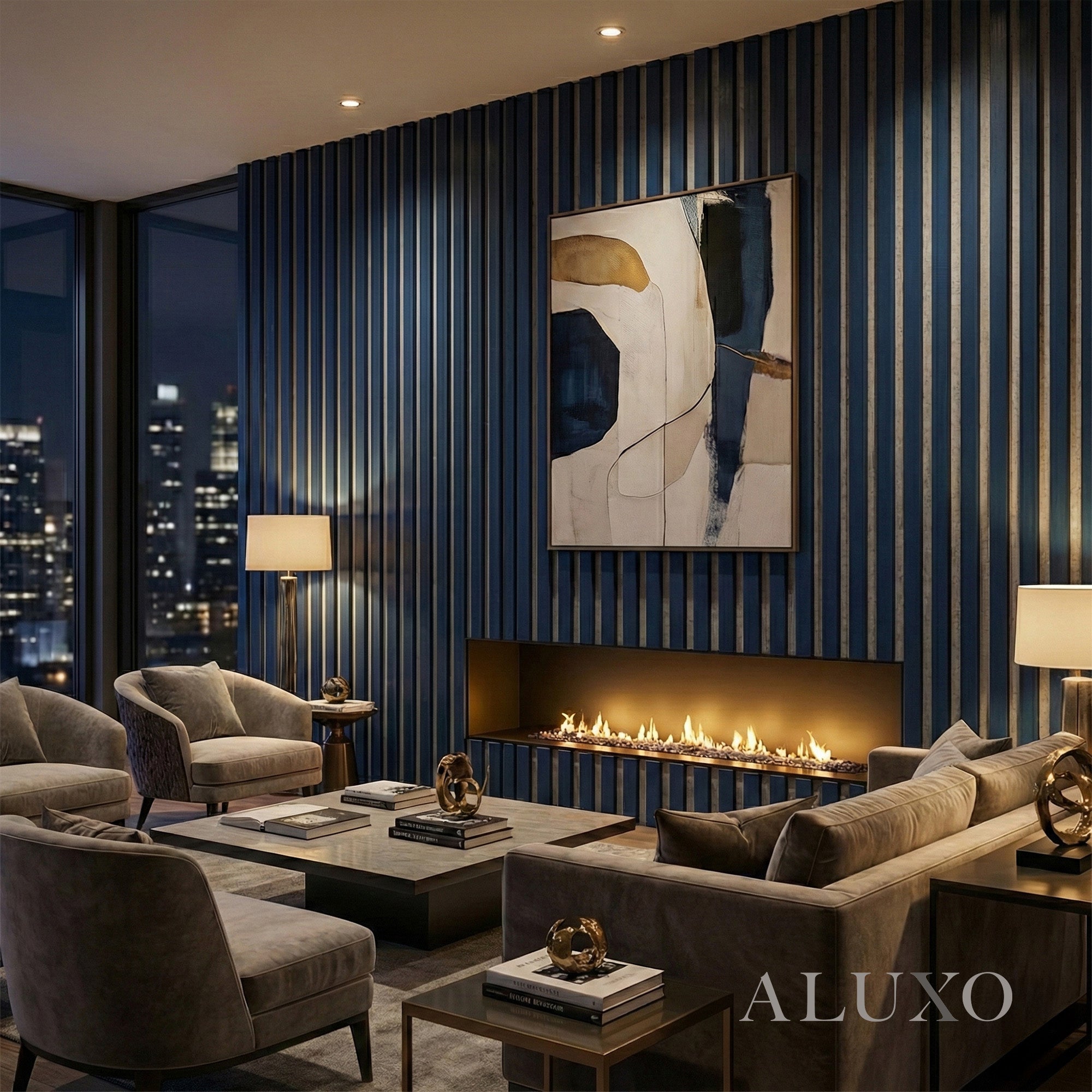 Discover a sophisticated play on colour with the Aluxo Blue Coloured Acoustic Slat Wall Panel featuring a refined Grey felt backing. This unique combination pairs vibrant, 3-sided wrapped blue slats with a soft grey acoustic layer, creating a contemporary multi-tonal effect that adds depth and visual interest to any modern interior. Aluxo-Track Aluxo-TrackCopy