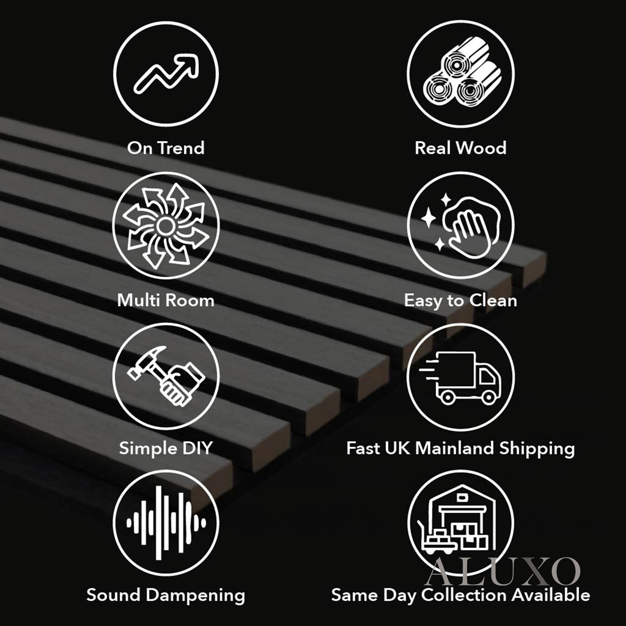 Elevate your space with striking slatted wall and ceiling panels featuring a solid wood core mounted on sound-absorbing PET felt backing to reduce room echo and ambient noise. Maintenance is simple — just vacuum or wipe clean with a damp cloth.