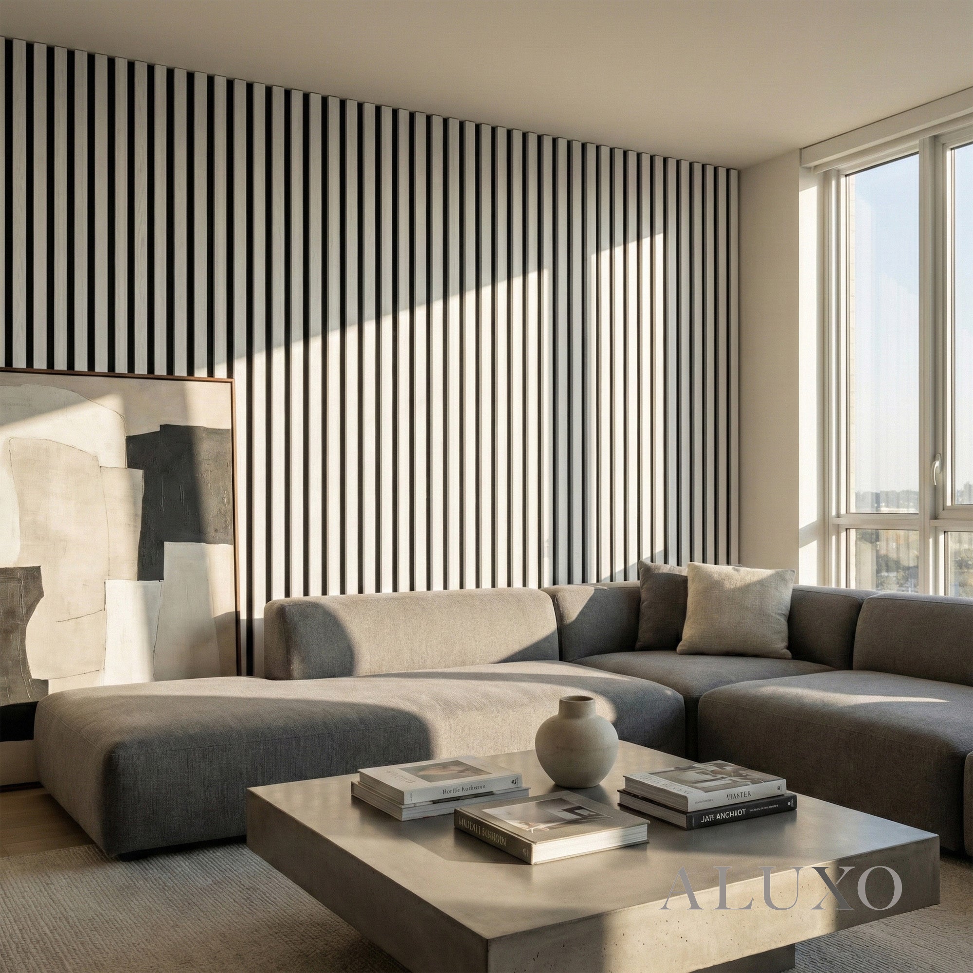 The Dove Grey Coloured Wide Slat Acoustic Panel represents a premium alternative for those seeking a more substantial, architectural look. Featuring an upgraded 40mm wide slat and a crisp 10mm gap, this modern aesthetic delivers a bolder linear texture than standard versions, introducing a sense of calm and contemporary luxury to your space with its seamless 3-sided wrap-around edge. Aluxo-Track Aluxo-TrackCopy