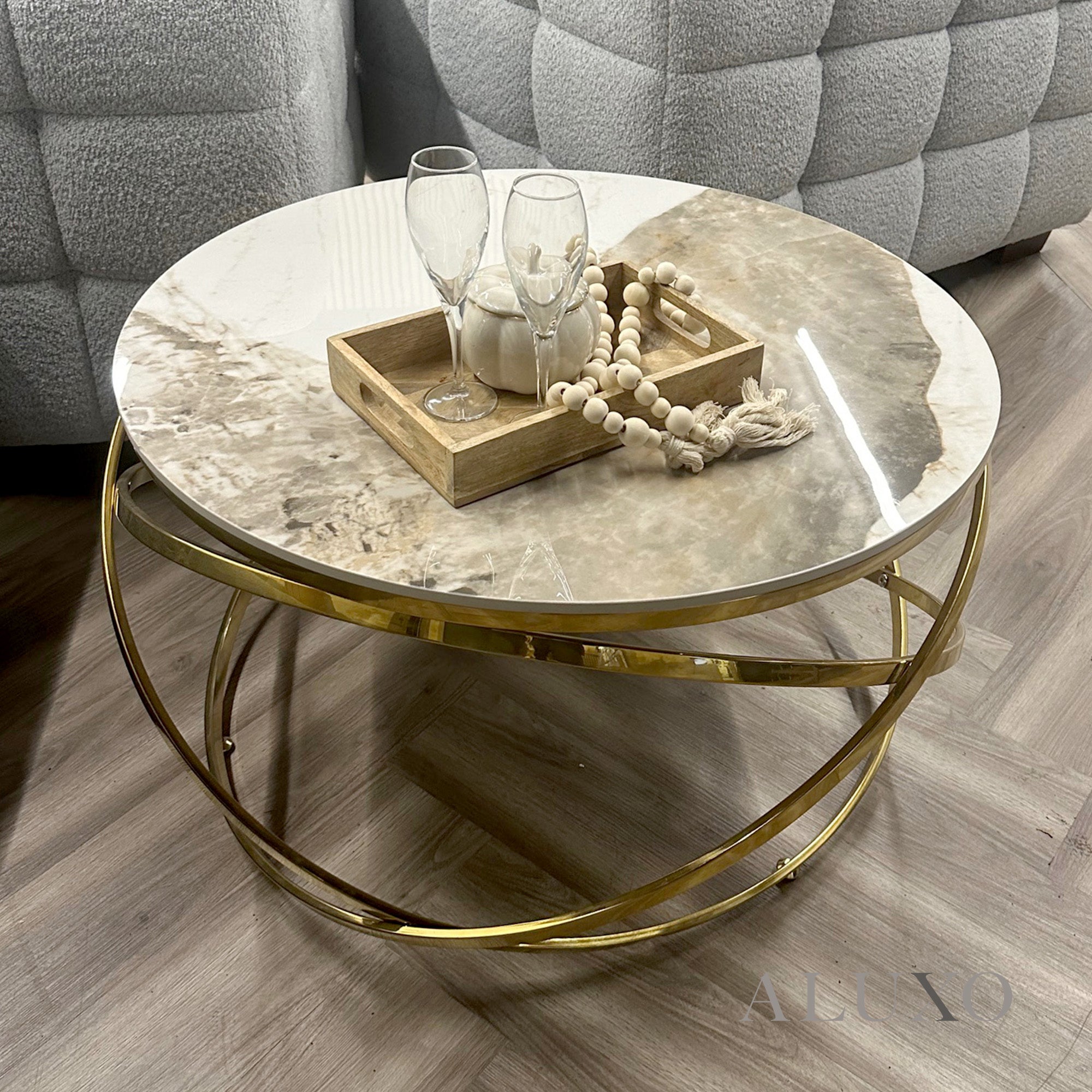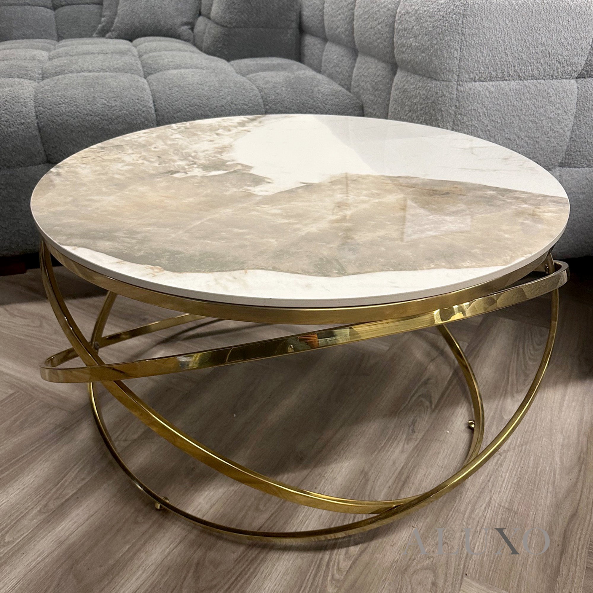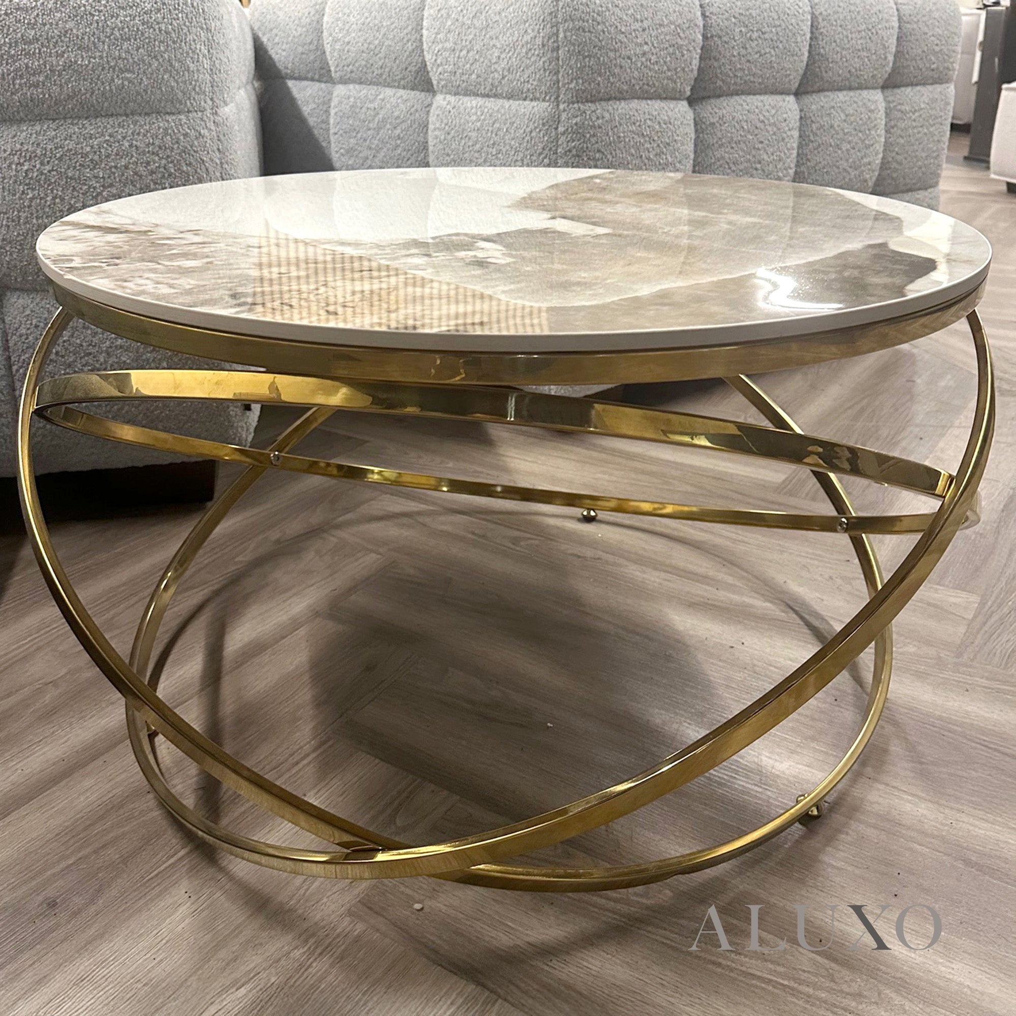 Introduce timeless sophistication to your living room with the Stig Gold Round Coffee Table, featuring a striking cream sintered stone top resting on an elegant three-ring gold metal frame. Its unique sculptural form brings both functionality and luxury to modern interiors. Aluxo-Track:StigGoldCoffeeTable