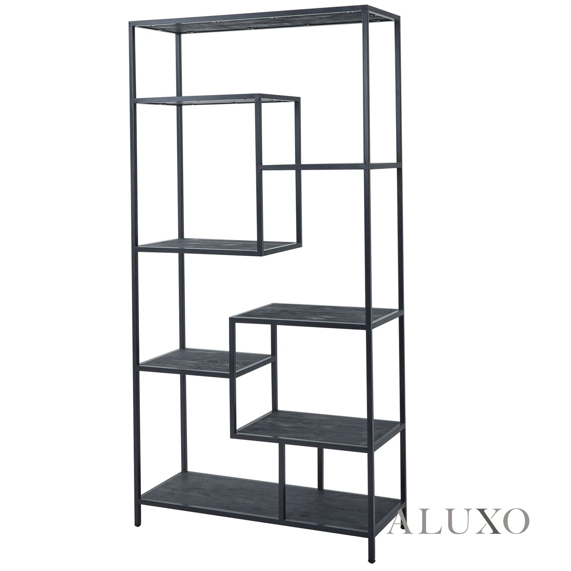 Crafted in deep black metal, its lattice-like frame and varied shelf depths encourage creative styling — from artful decor layering to curated retail presentation. Use it as a freestanding room divider or statement backdrop. The strong linear form complements both modern and industrial settings with refined boldness. Aluxo-Key:ASYMUNIT7X40
