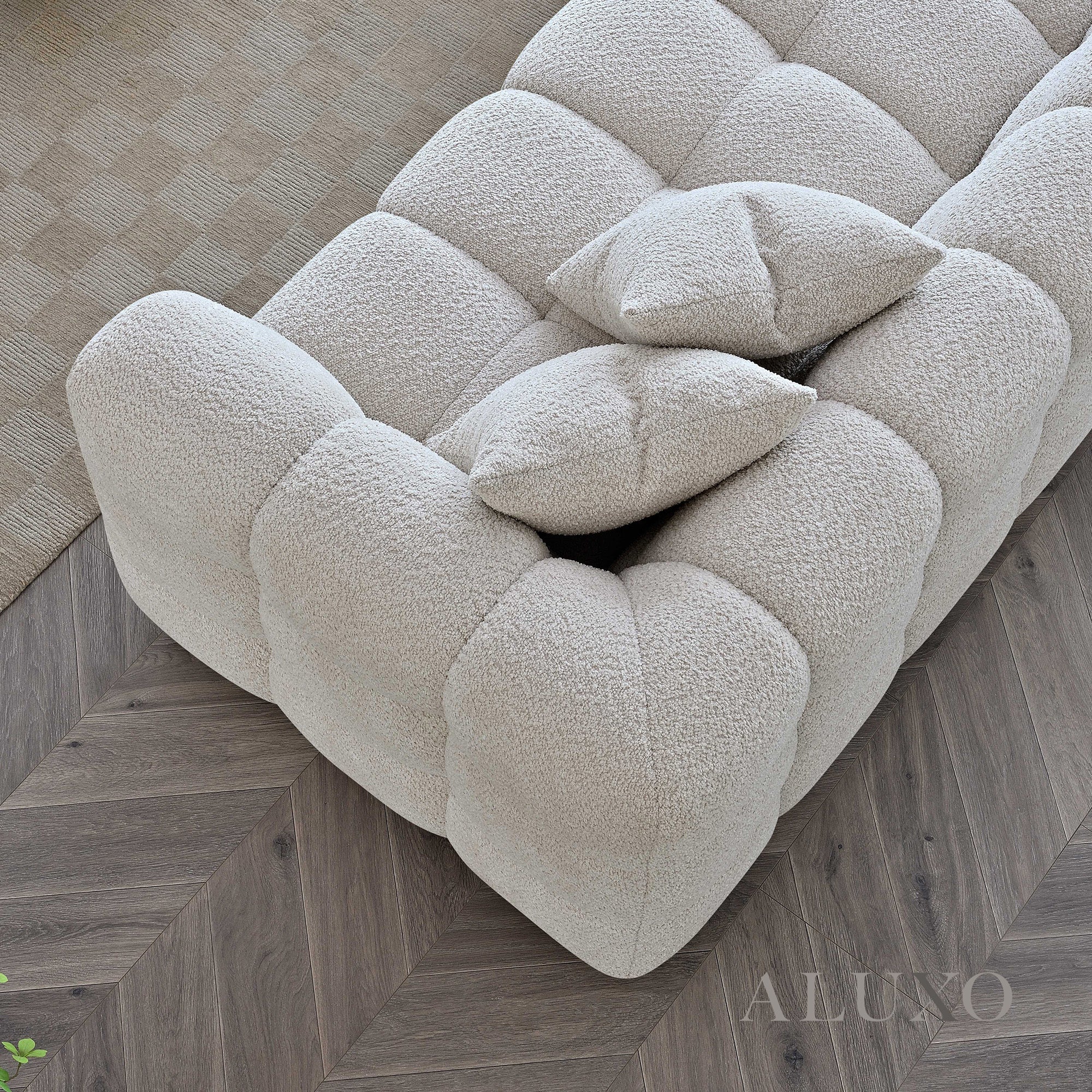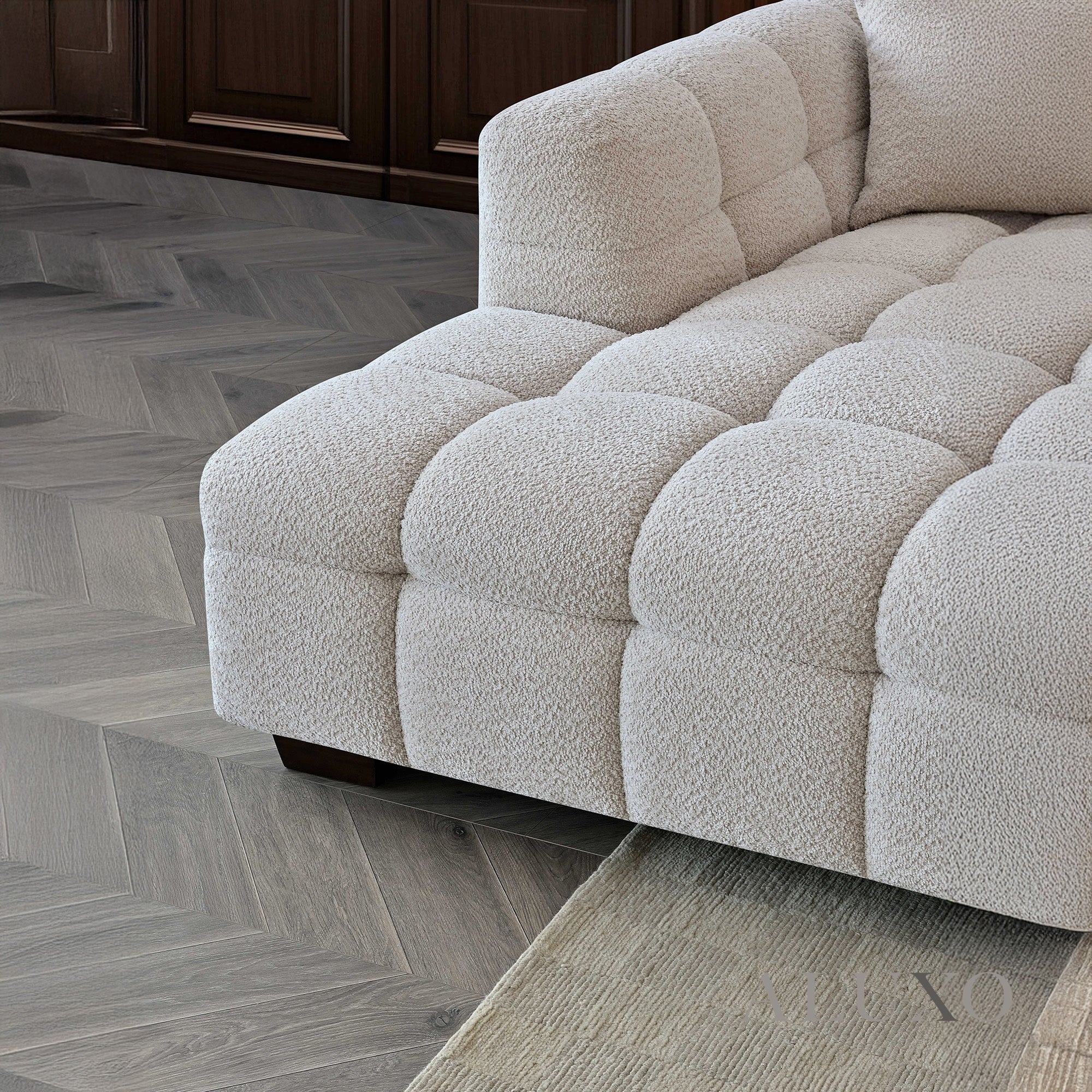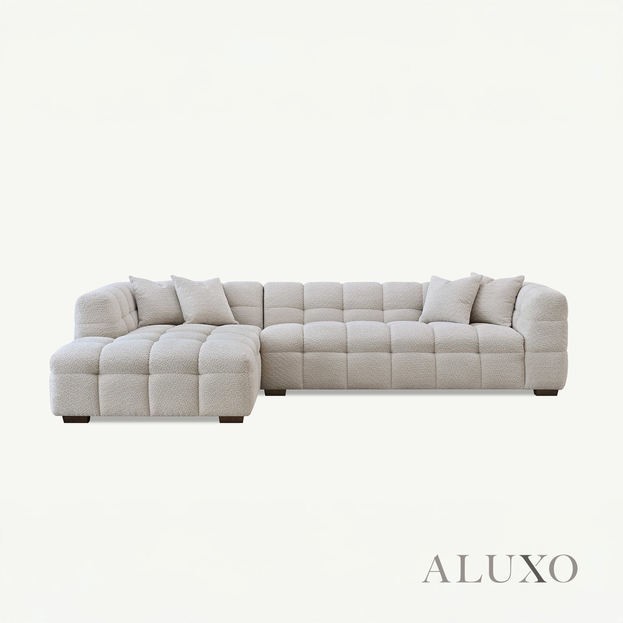 Crafted with deep channel stitching and upholstered in a stunning oatmeal beige bouclé fabric, the Tribeca Corner Sofa combines modern luxury with timeless opulence. Its bold Chesterfield-inspired silhouette softened by gentle curves makes it an elegant and inviting centrepiece for any home.