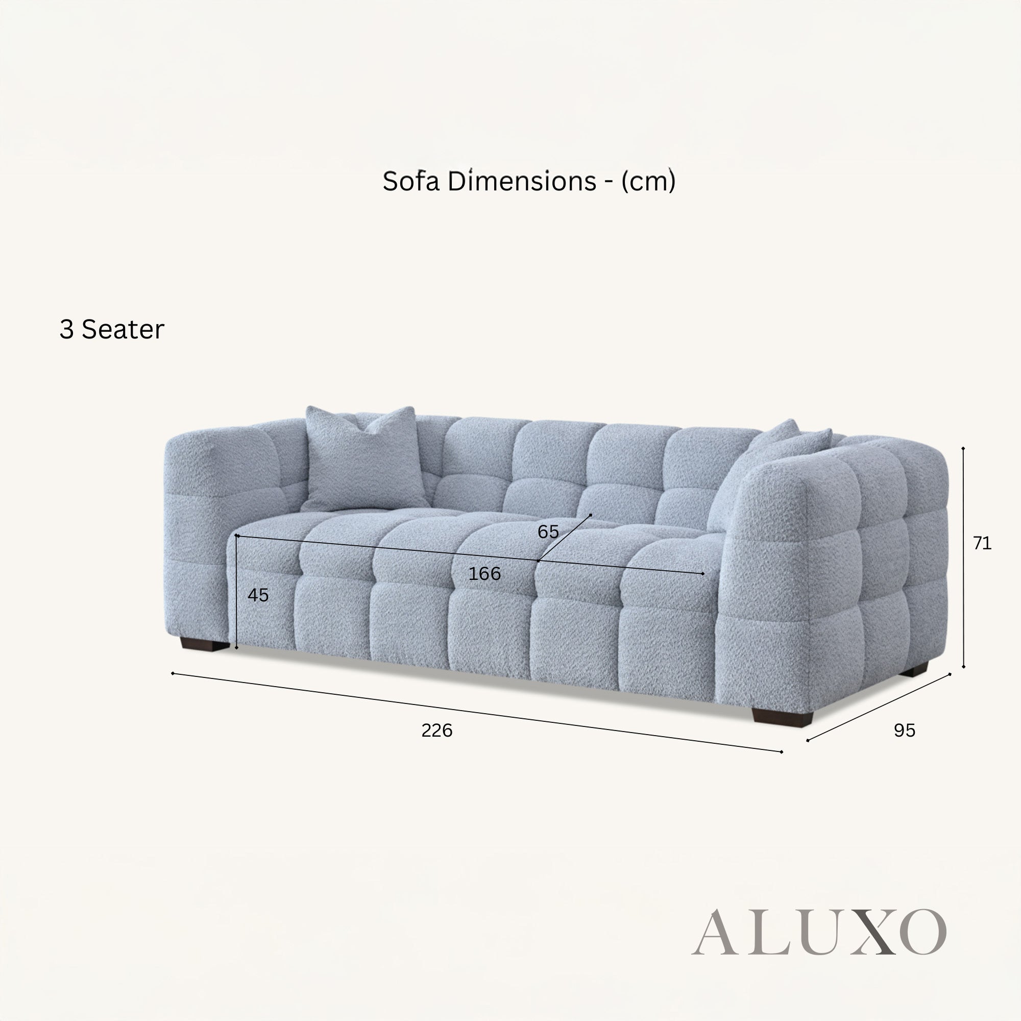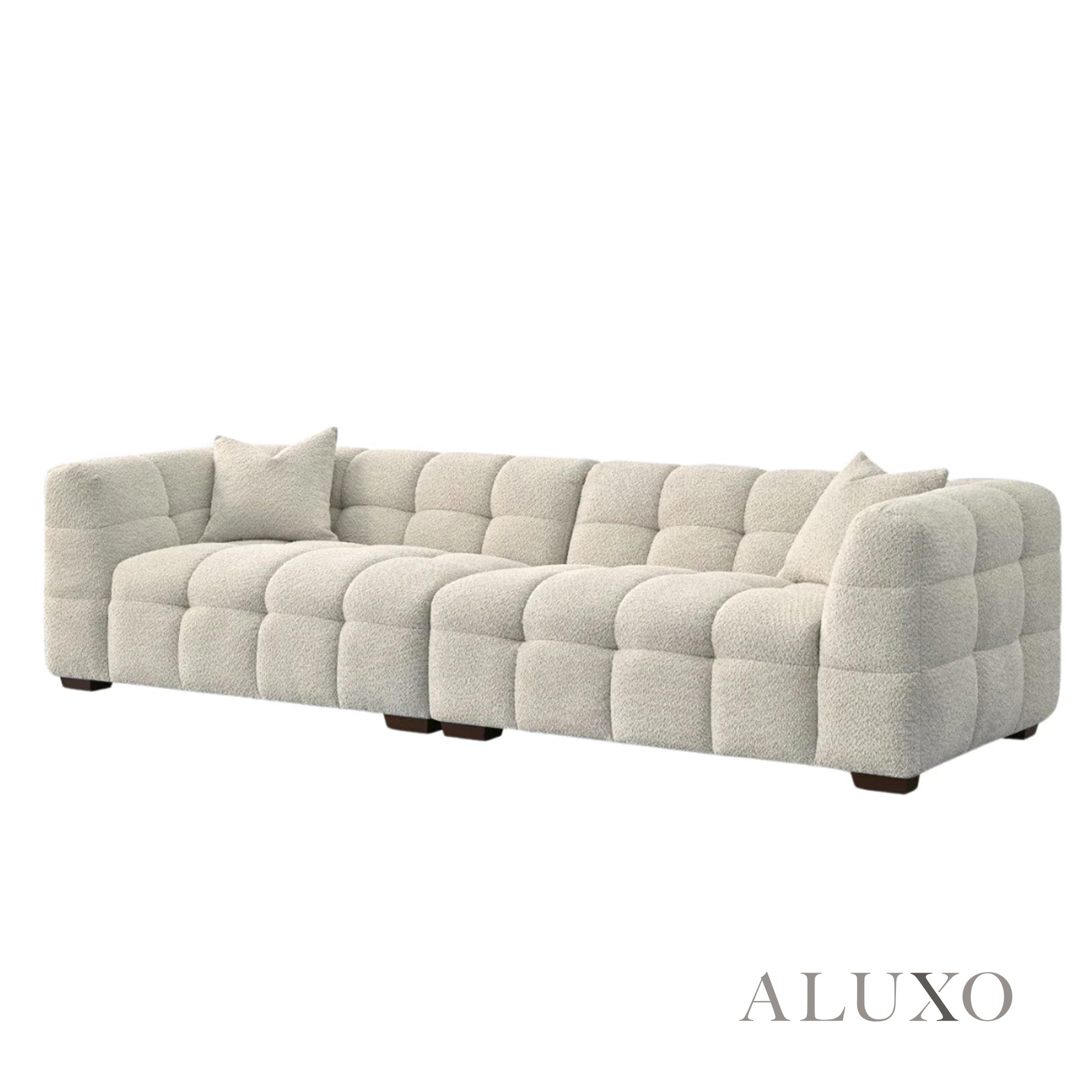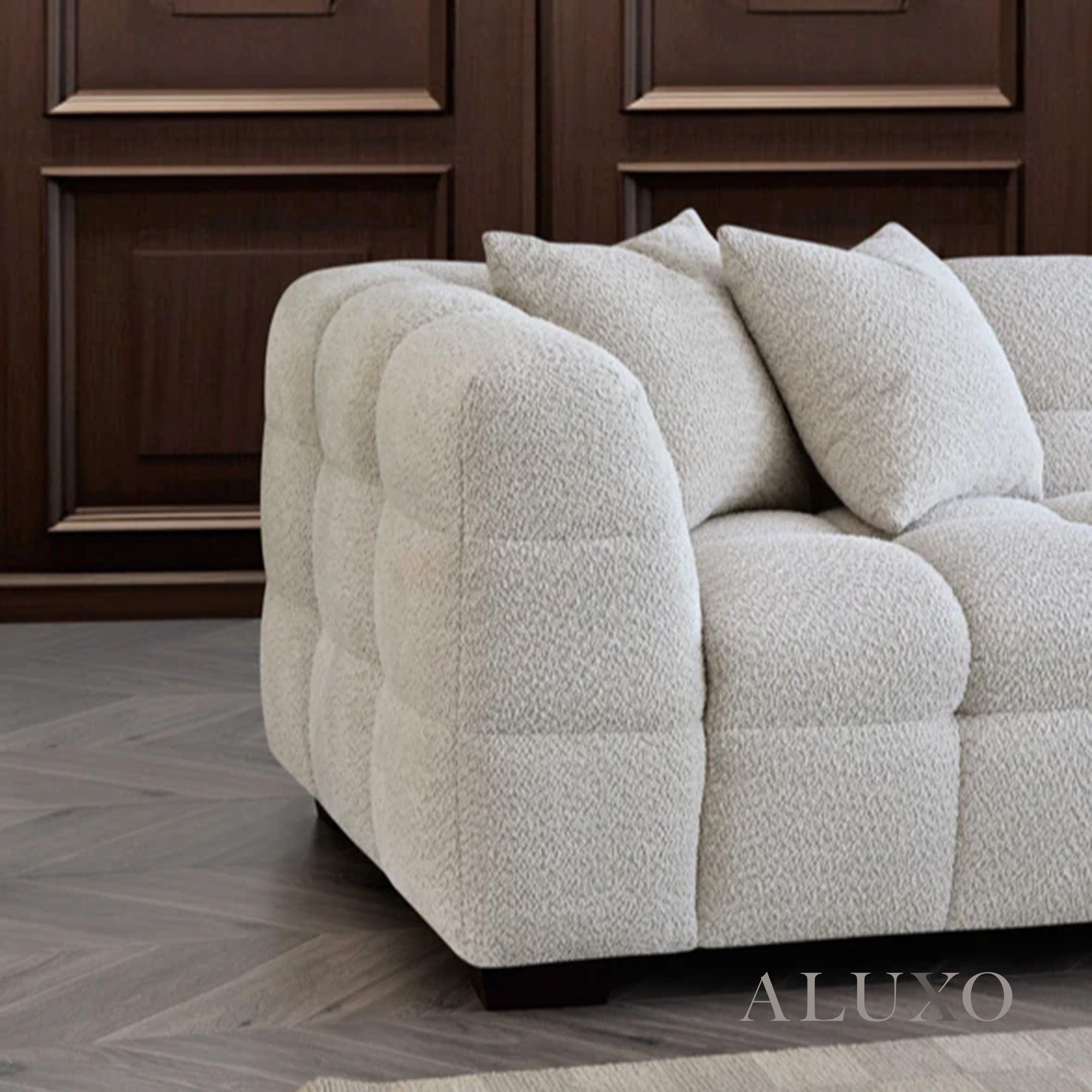 Create a space of subtle sophistication with the Tribeca Sofa Collection in Oatmeal Beige – a warm, neutral palette that enhances any interior scheme. Wrapped in a tactile Aluxo-Track Aluxo-TrackCopy oatmeal-toned bouclé fabric, this collection merges gentle curves with sculptural form and deep channel stitching, adding both texture and refinement to your home.