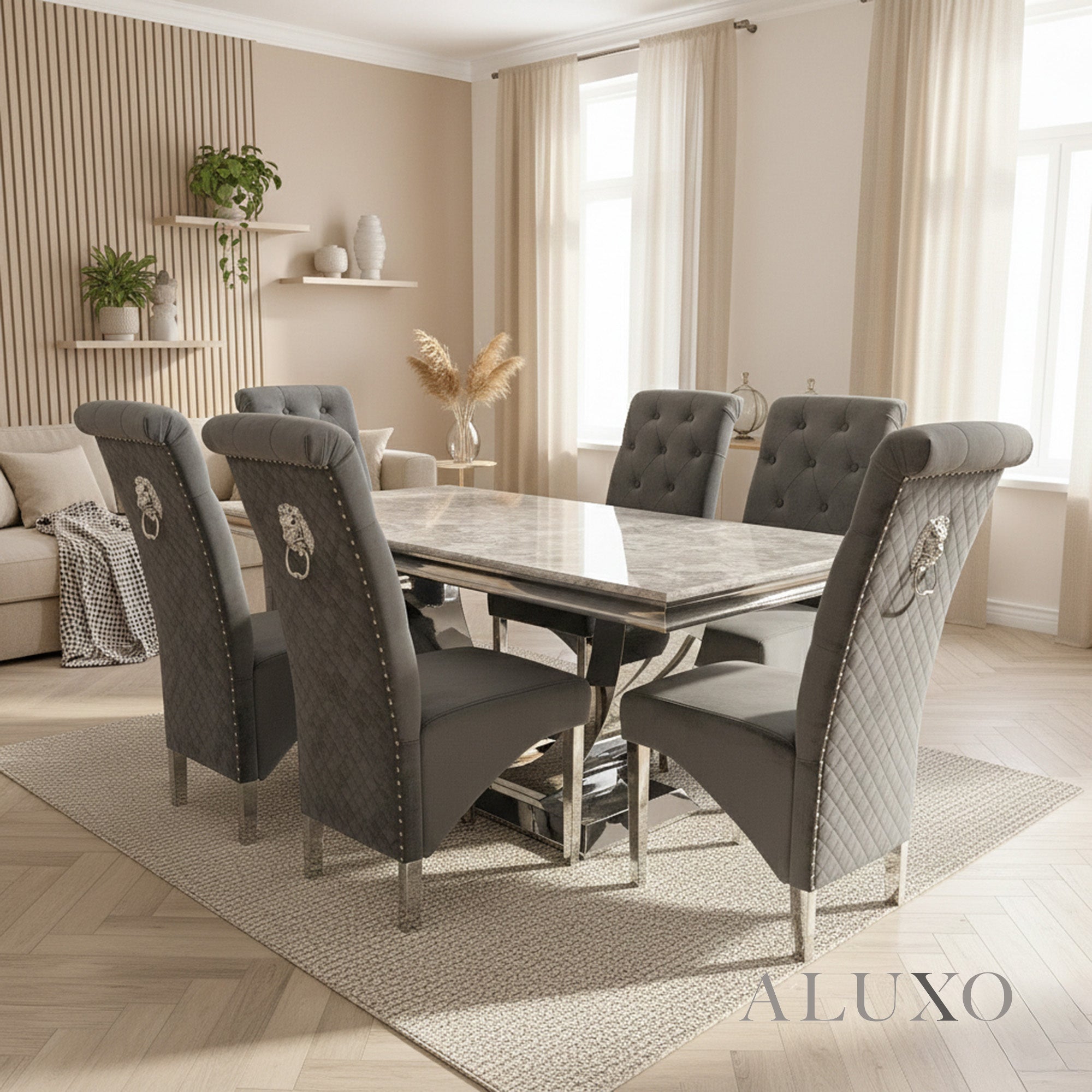 The Einar Velvet Dining Chairs feature a soft velvet finish, chrome lion knocker, quilted stitching, scroll top and button detailing. Fully UK fire retardant tested, they offer ergonomic comfort with premium foam support and polished chrome legs for a refined touchUrb-Dim.