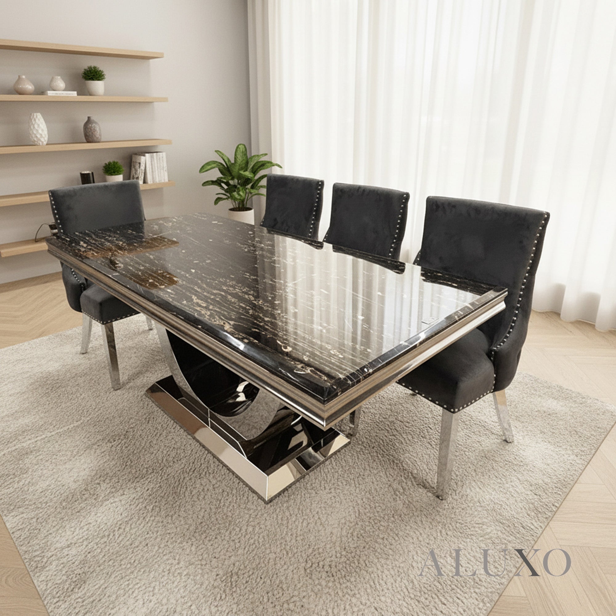 Introducing the Urban 1.8m Black & Gold Marble Dining Set — a modern centrepiece combining a premium 15–25mm marble laminate top with a polished chrome U-base. Ideal for 4–8 diners, it delivers contemporary elegance with everyday durabilityUrb-Black.