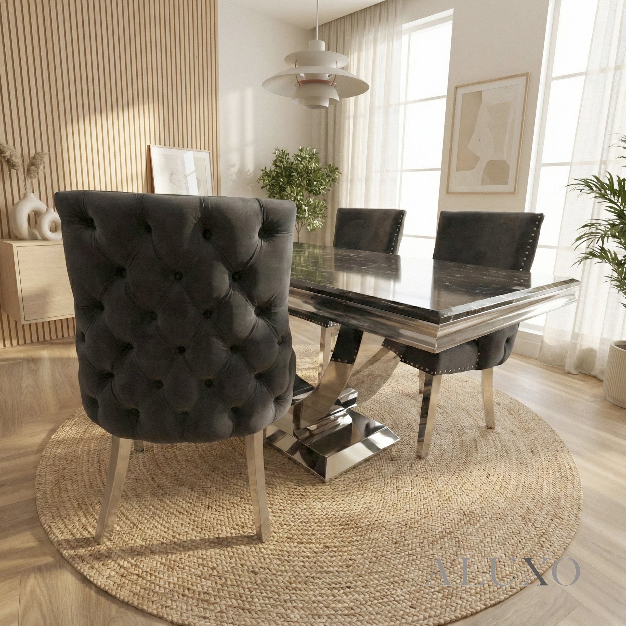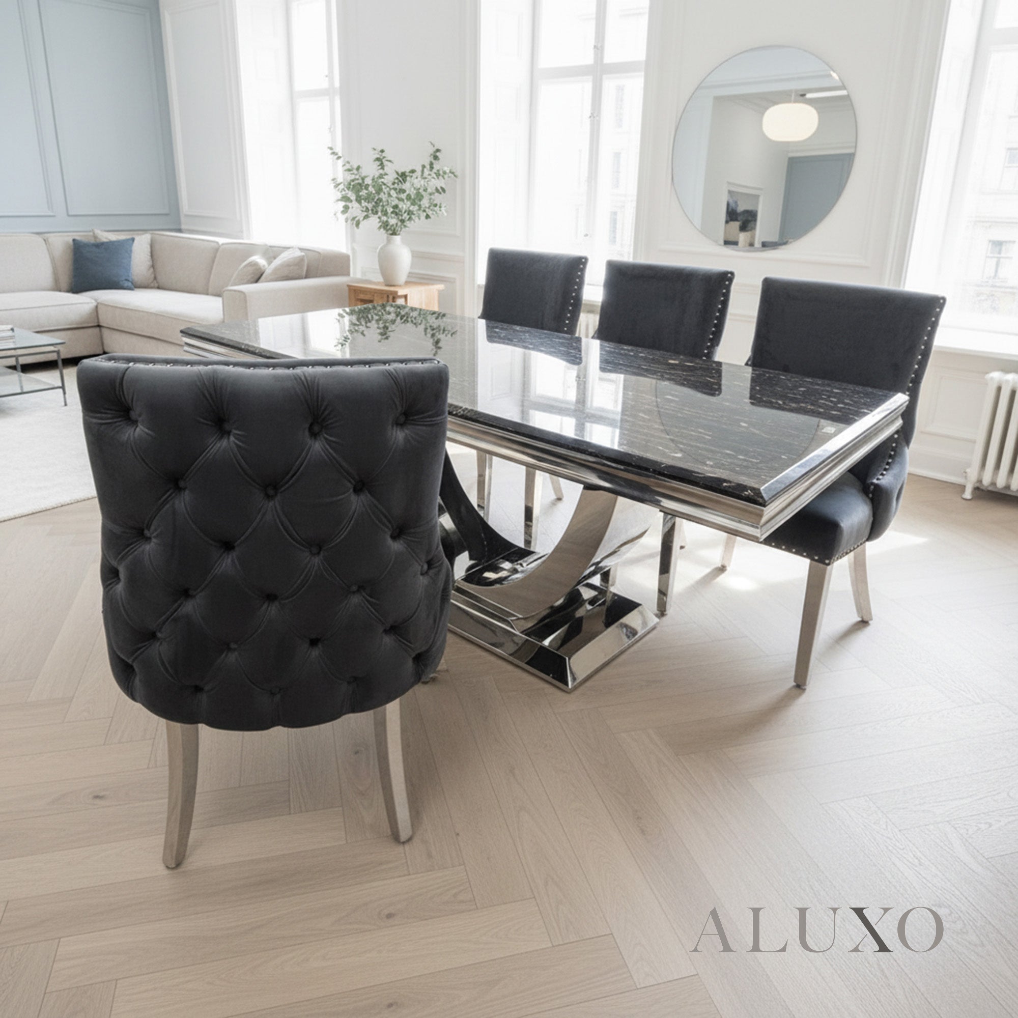 Paired with Oskar Velvet Dining Chairs, featuring plush velvet upholstery, button-back detailing, stud accents and chrome straight legs curved at the back. Fully UK Fire Retardant tested and crafted for comfort and timeless styleUrb-Chair.