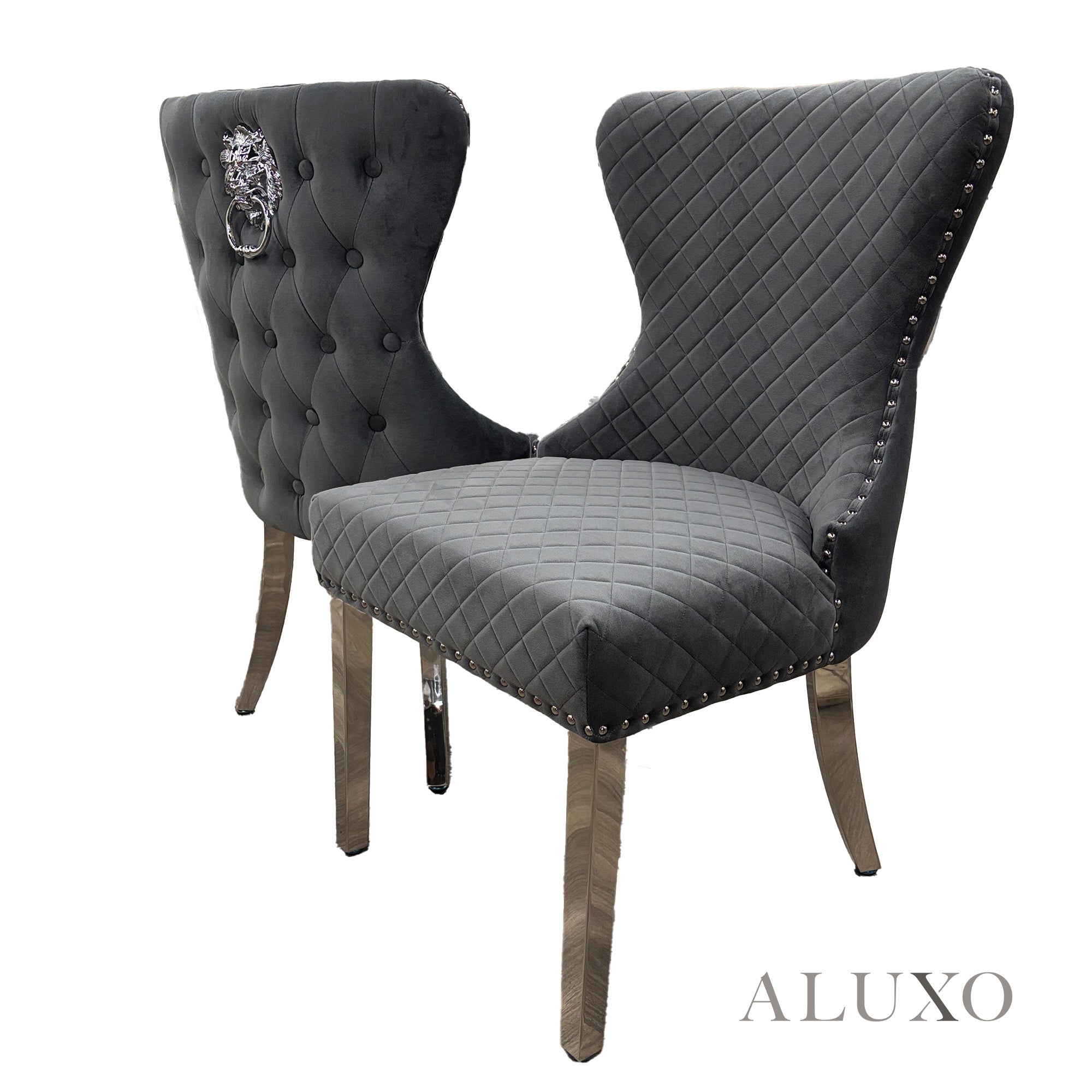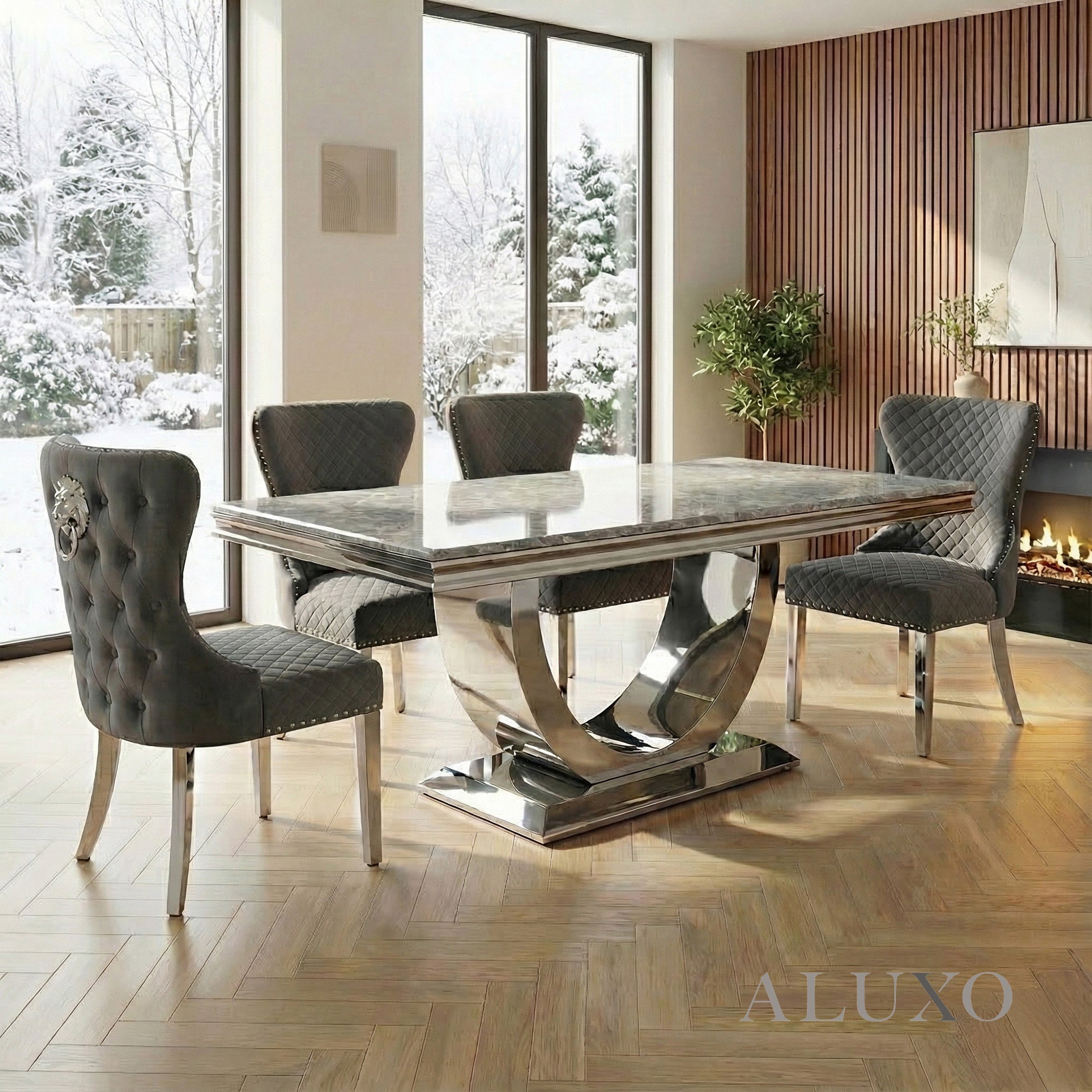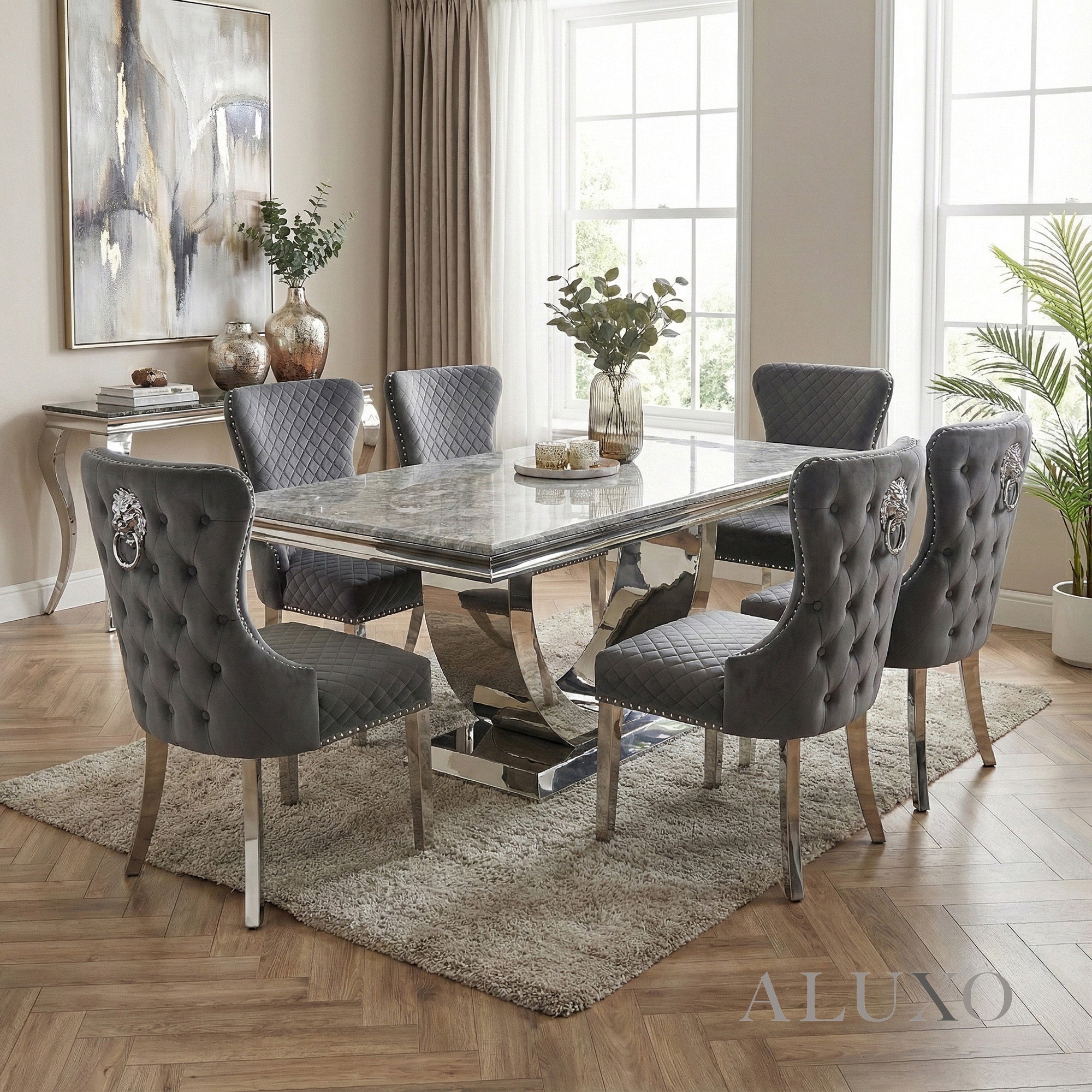 Paired with Chelsea Velvet Dining Chairs, each crafted with plush velvet upholstery, a chrome lion knocker, button-tufted back and studded details. Fully UK fire retardant tested and designed with supportive padding for comfortable, ergonomic seatingUrb-Dim.