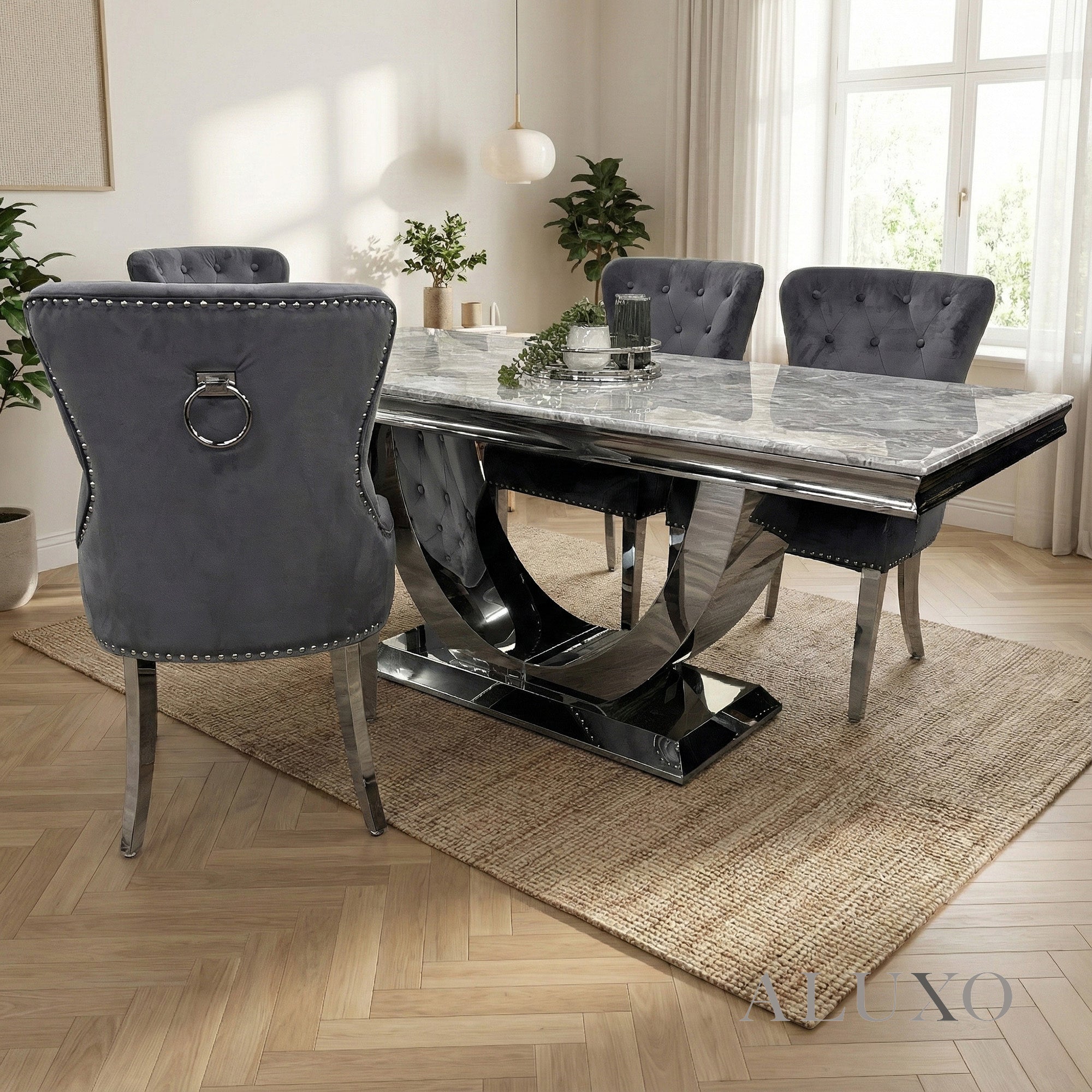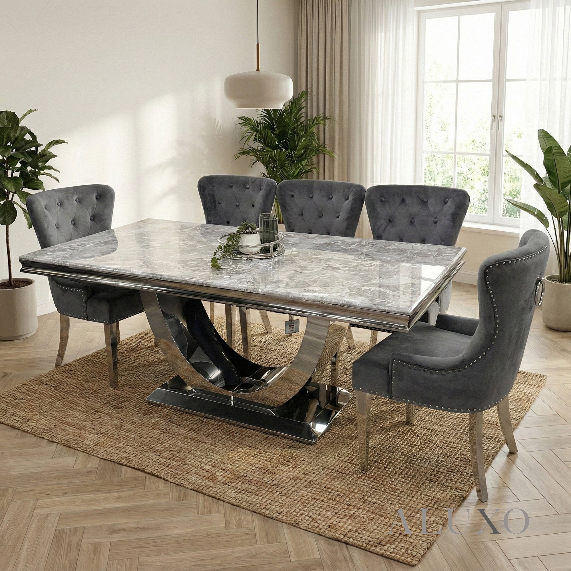 The soft light grey marble surface brings a refined and modern aesthetic to any dining space, while the heavy chrome pedestal base offers outstanding stability and structural support. Its smooth, wipe-clean finish makes it ideal for busy households, comfortably seating up to eight diners for family meals or entertaining guestsUrb-Key.