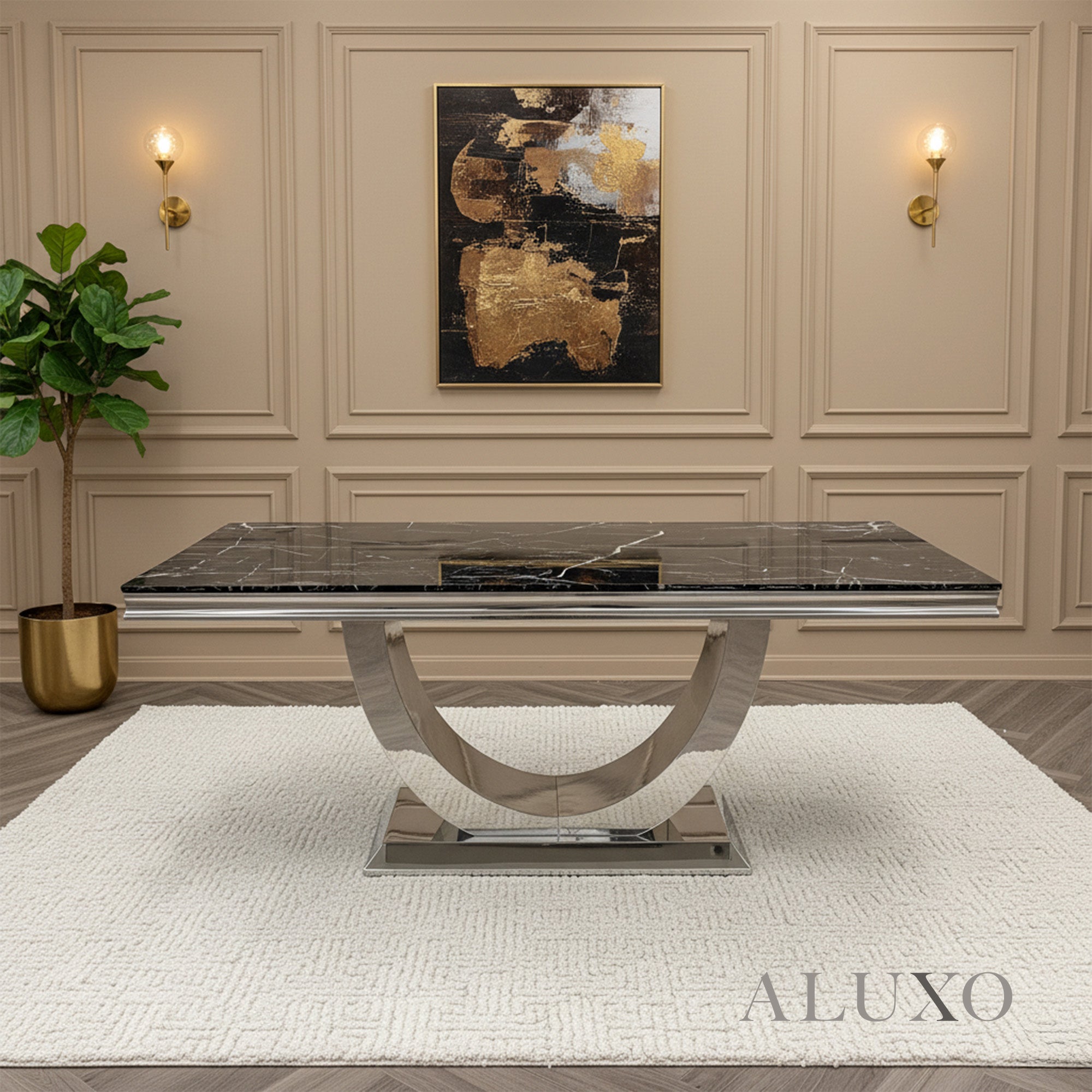 Crafted with a high-quality 15-25mm marble-effect top and paired with a polished stainless steel U-leg pedestal base, this table redefines modern luxury. The solid, heavy construction ensures outstanding stability, while the smooth surfaces make cleaning effortless – ideal for busy homes. URB-Key:UK-MBL