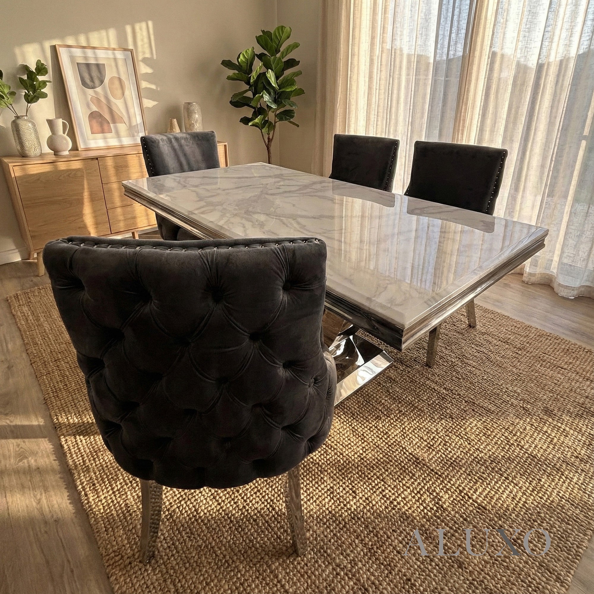 Paired with Oskar Velvet Dining Chairs, featuring plush velvet upholstery, button-back detailing, stud accents and chrome straight legs curved at the back. Fully UK Fire Retardant tested and crafted for comfort and timeless styleUrb-Chair.