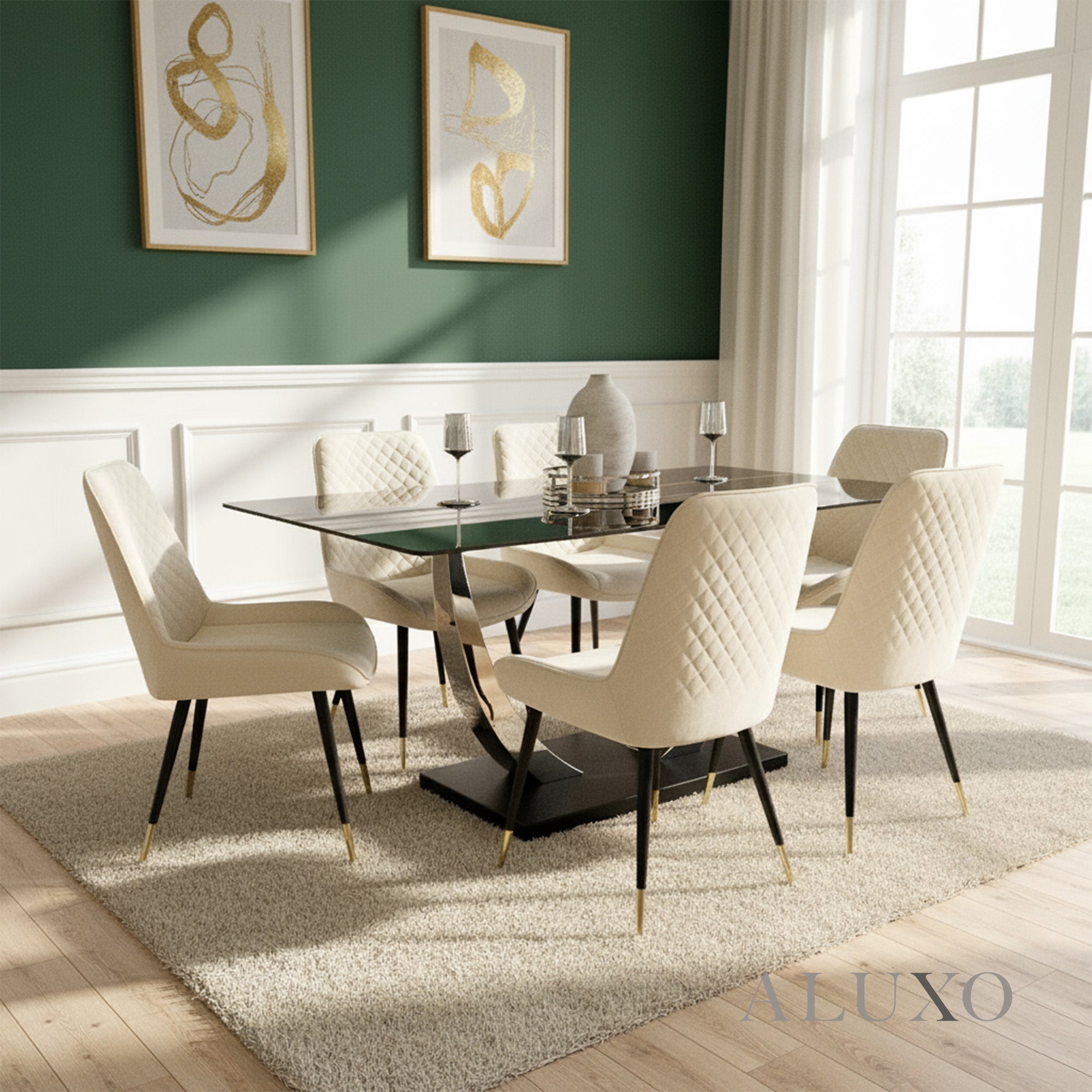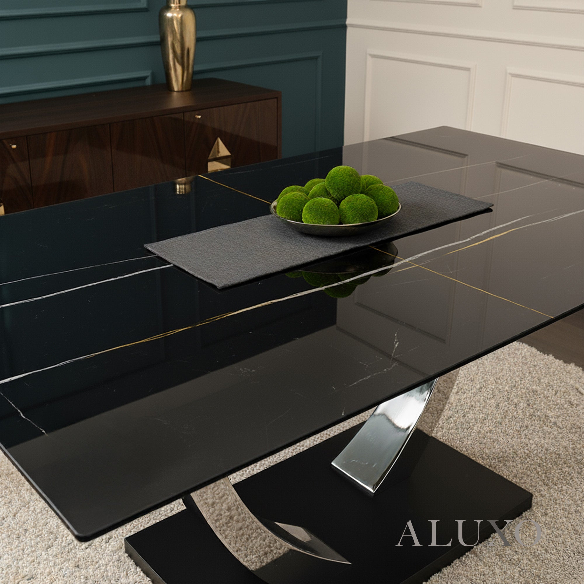 Featuring a 10mm black sintered stone tabletop with striking mustard-gold vein detailing, this table pairs natural stone-inspired beauty with cutting-edge durability. Resistant to heat, stains, and scratches, it’s designed for effortless maintenance and lasting quality. VAL-Key:UK-BLK