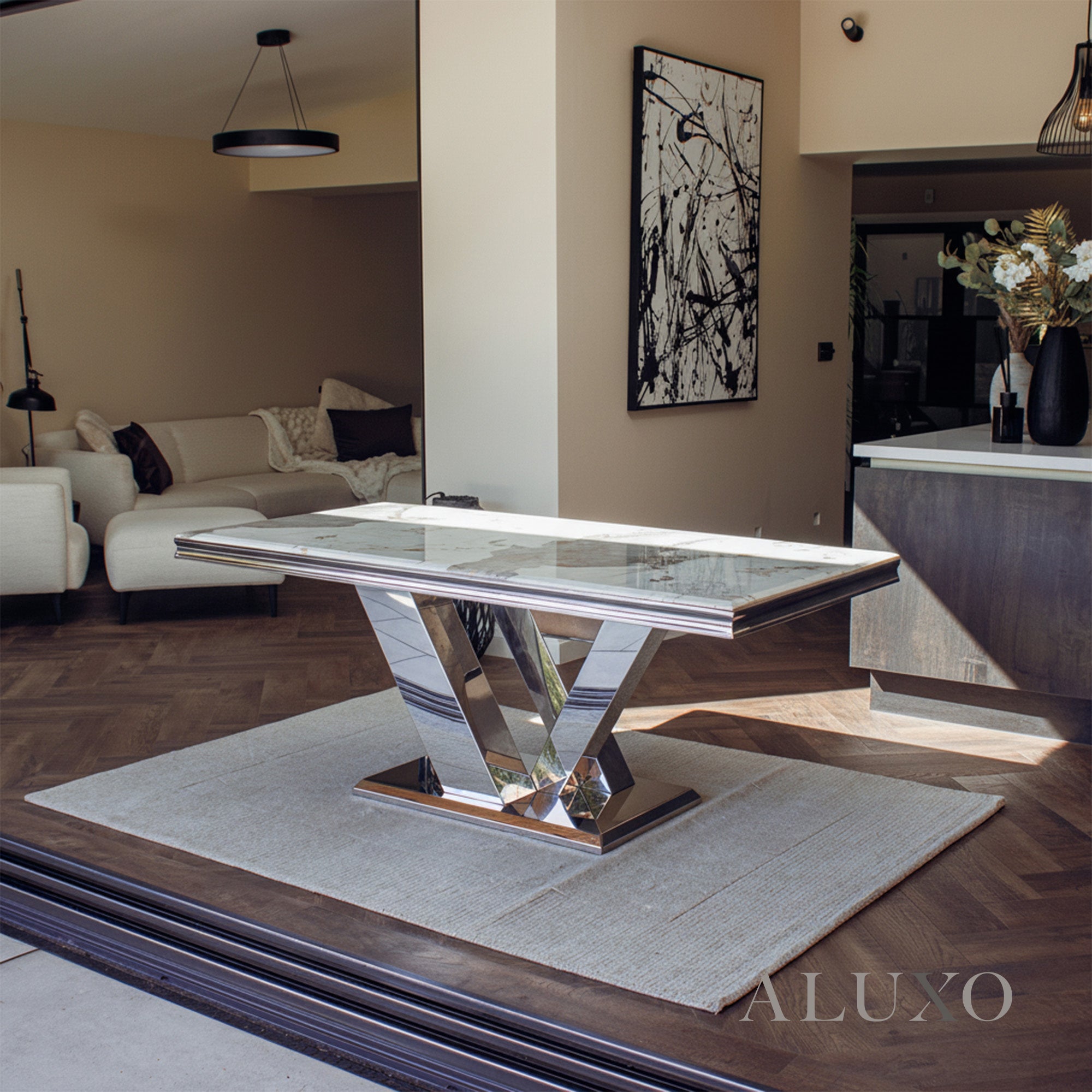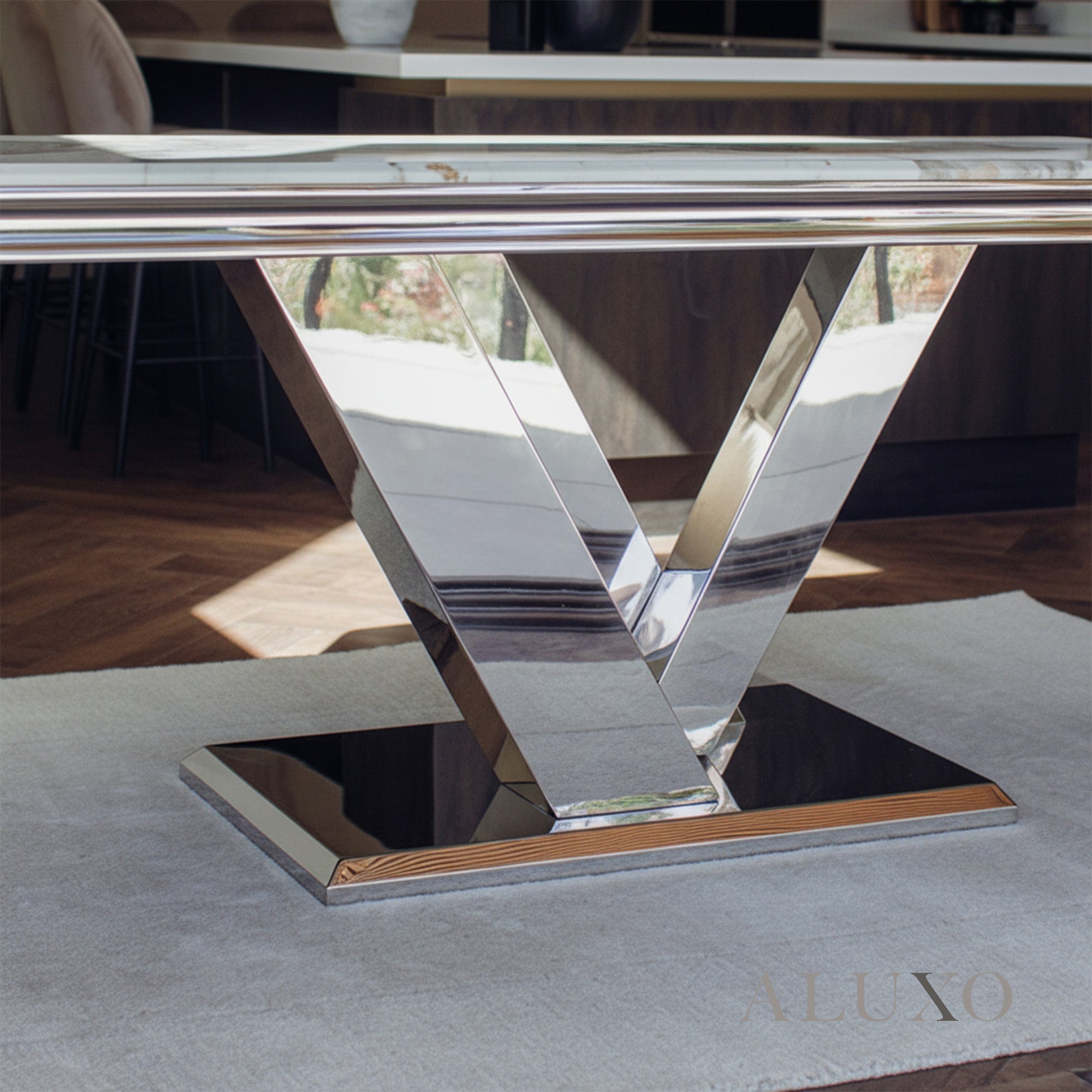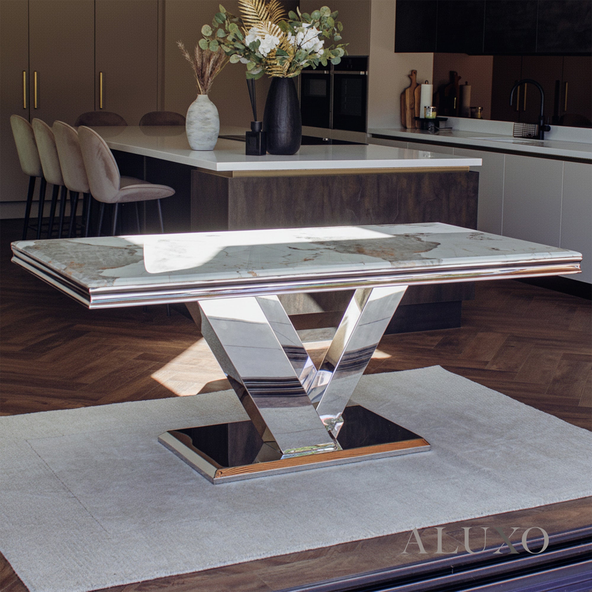 The Valeria Dining Table redefines luxurious dining with its grand scale and polished aesthetic. Featuring a 180cm rectangular marble top and iconic chrome V-shaped base, it brings a commanding presence to any modern dining space.