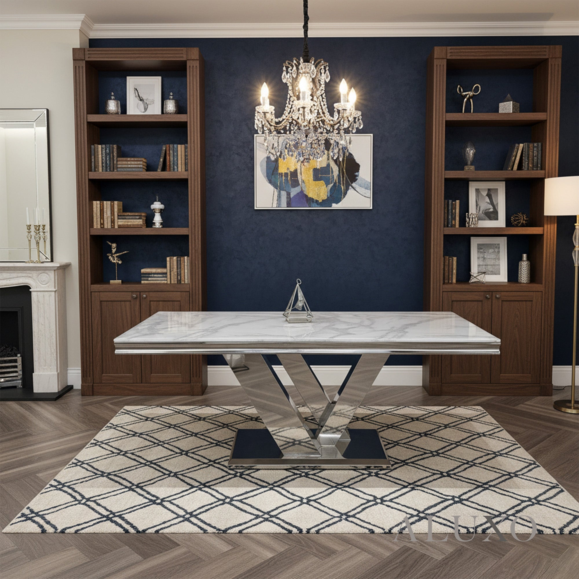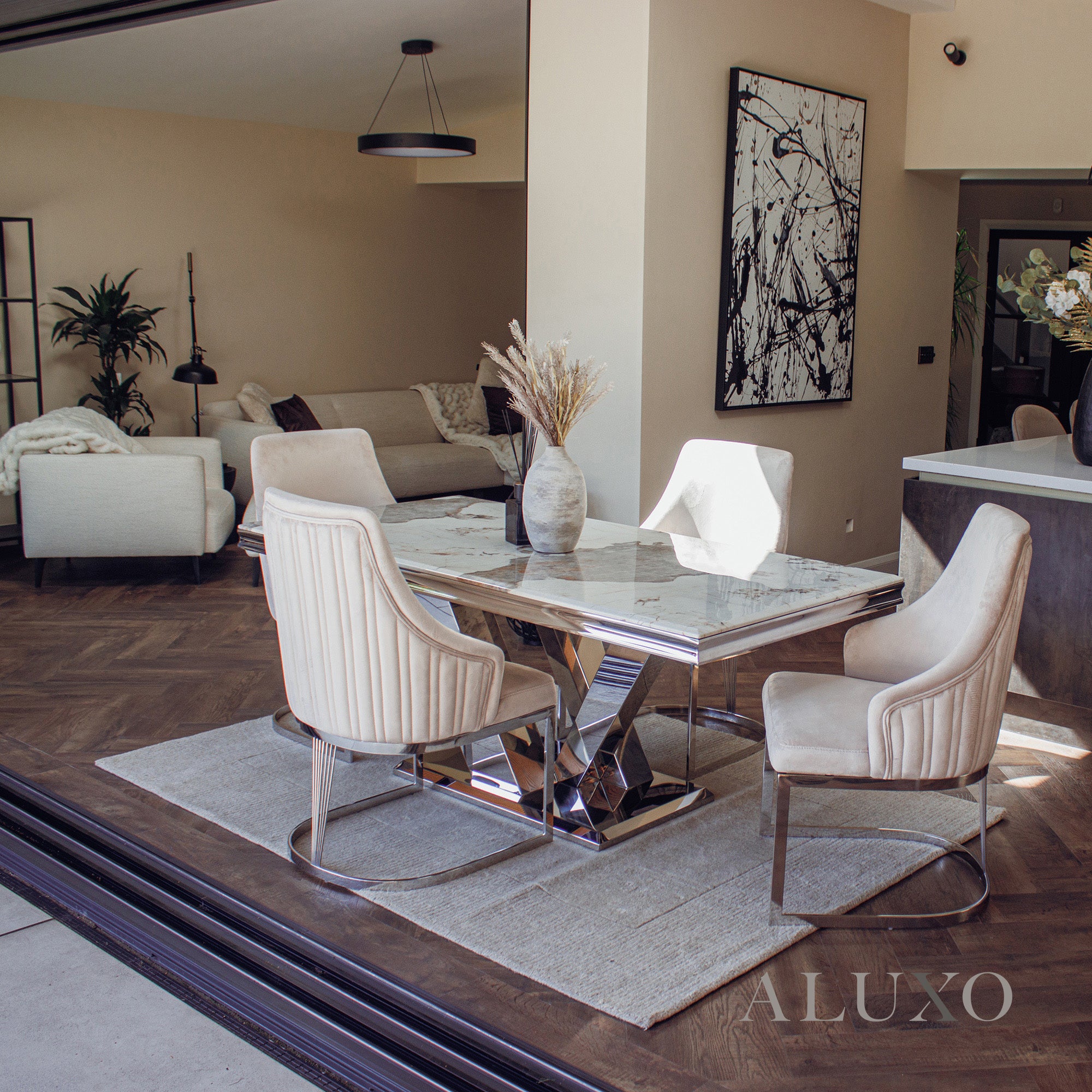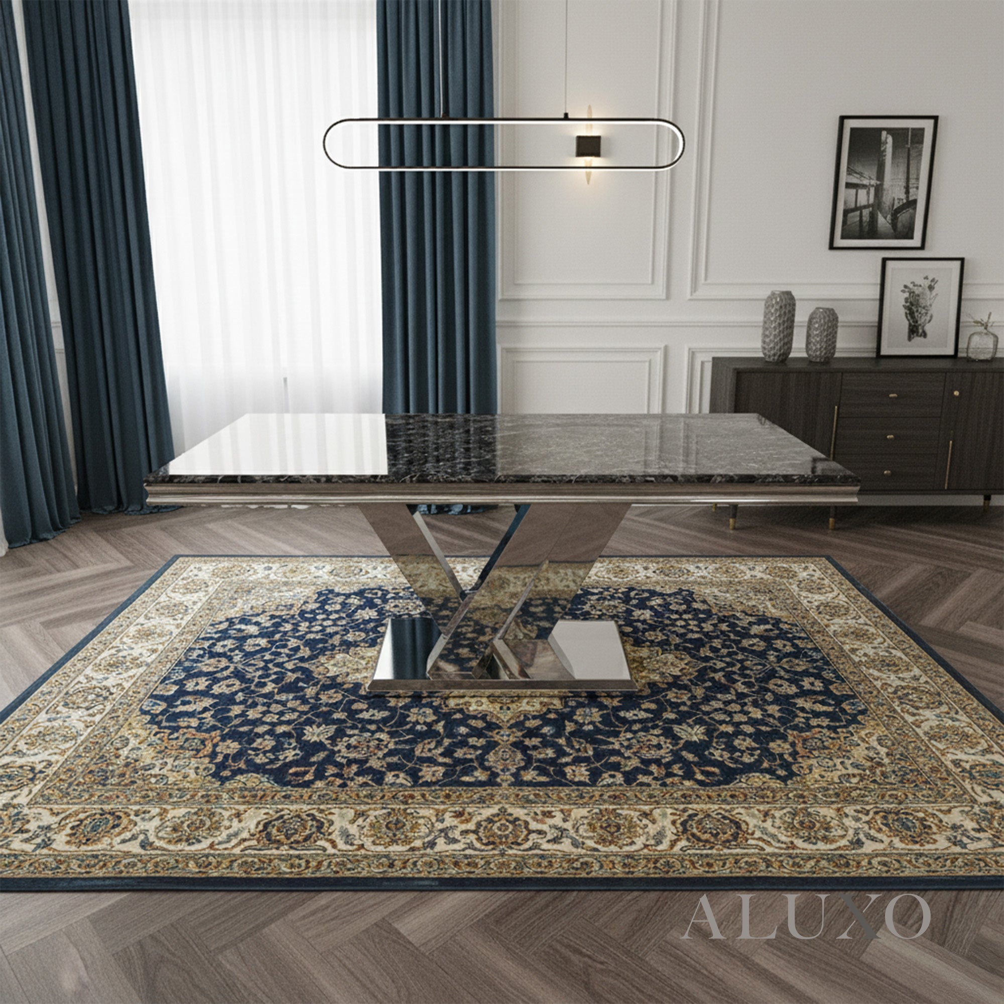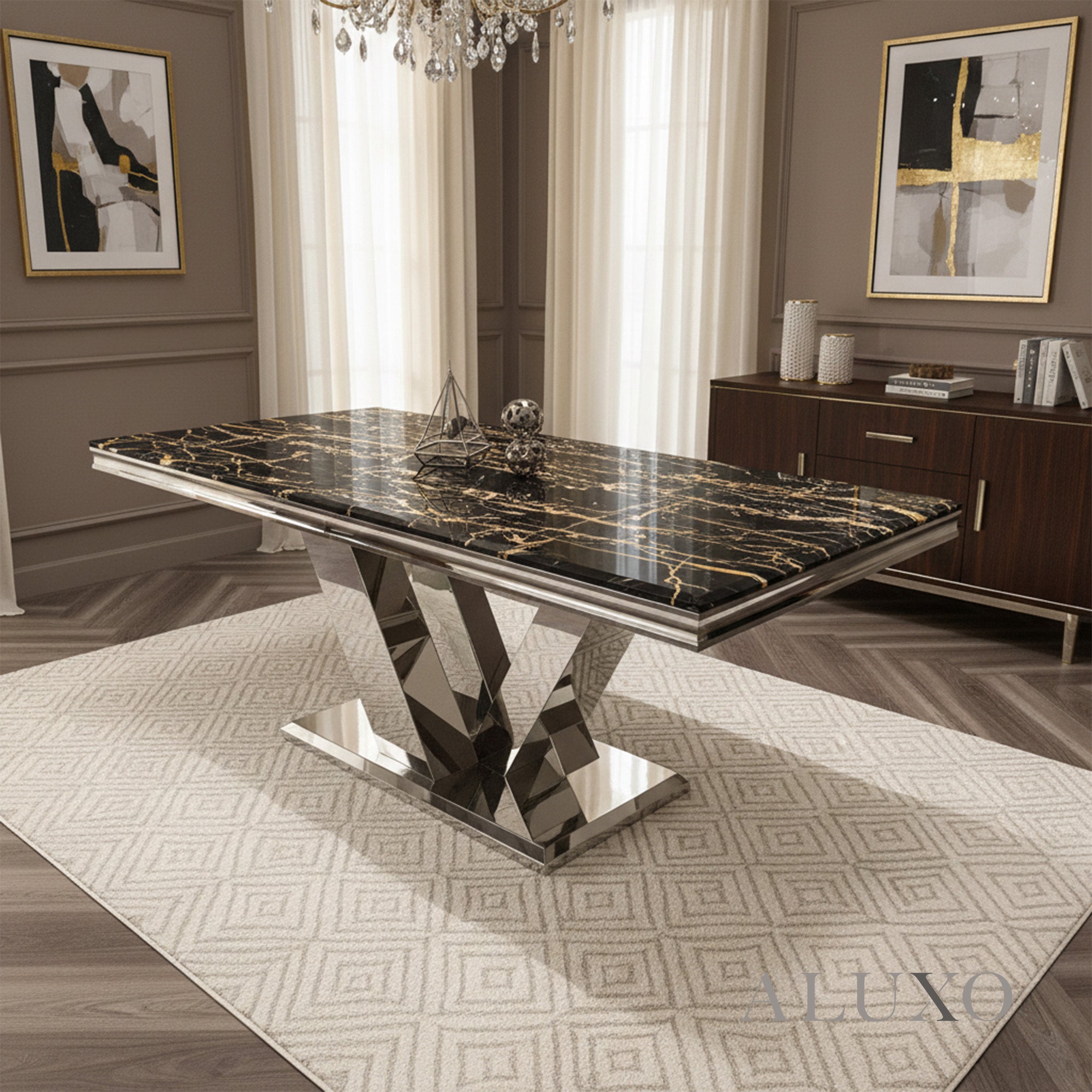 The Valeria Dining Table redefines luxurious dining with its grand scale and polished aesthetic. Featuring a 180cm rectangular marble top and iconic chrome V-shaped base, it brings a commanding presence to any modern dining space.