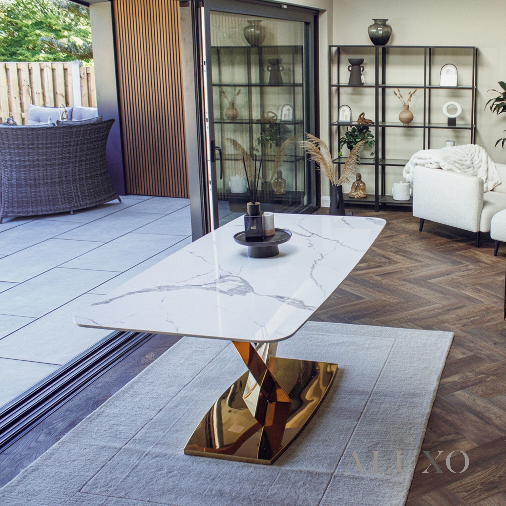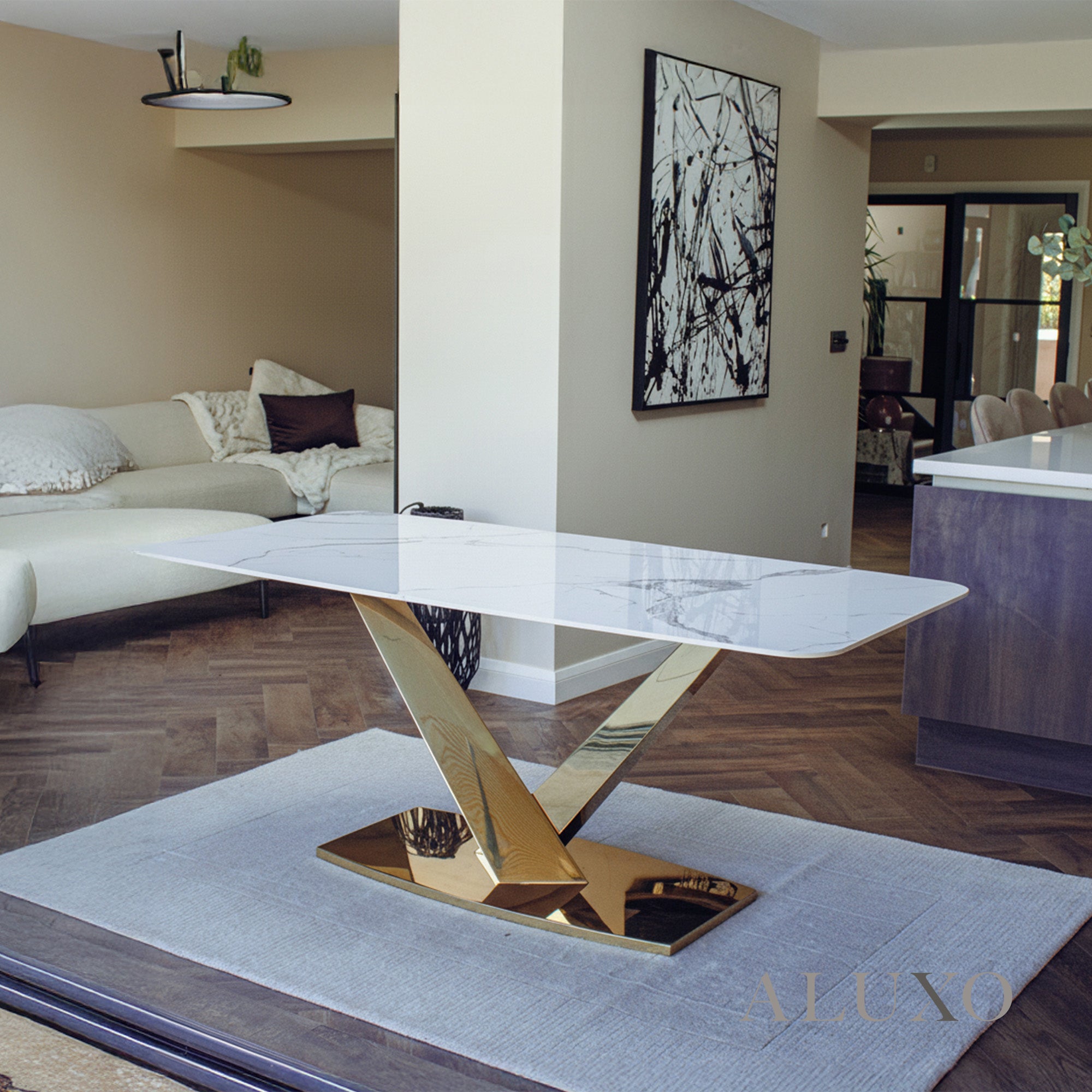Featuring a durable 10mm white sintered stone top that is both stylish and scratch-resistant, this table comfortably seats 6–8 guests and complements both minimalist and luxurious settings. Aluxo-Vittoria