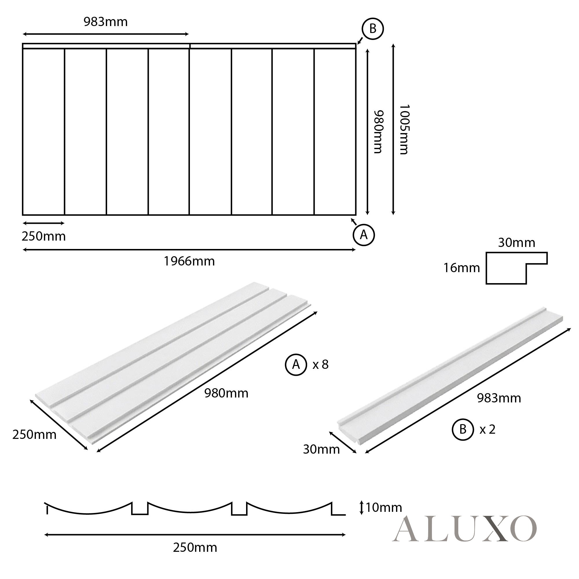 • Main Wave Panels (x8): H980mm x W250mm x D10mm