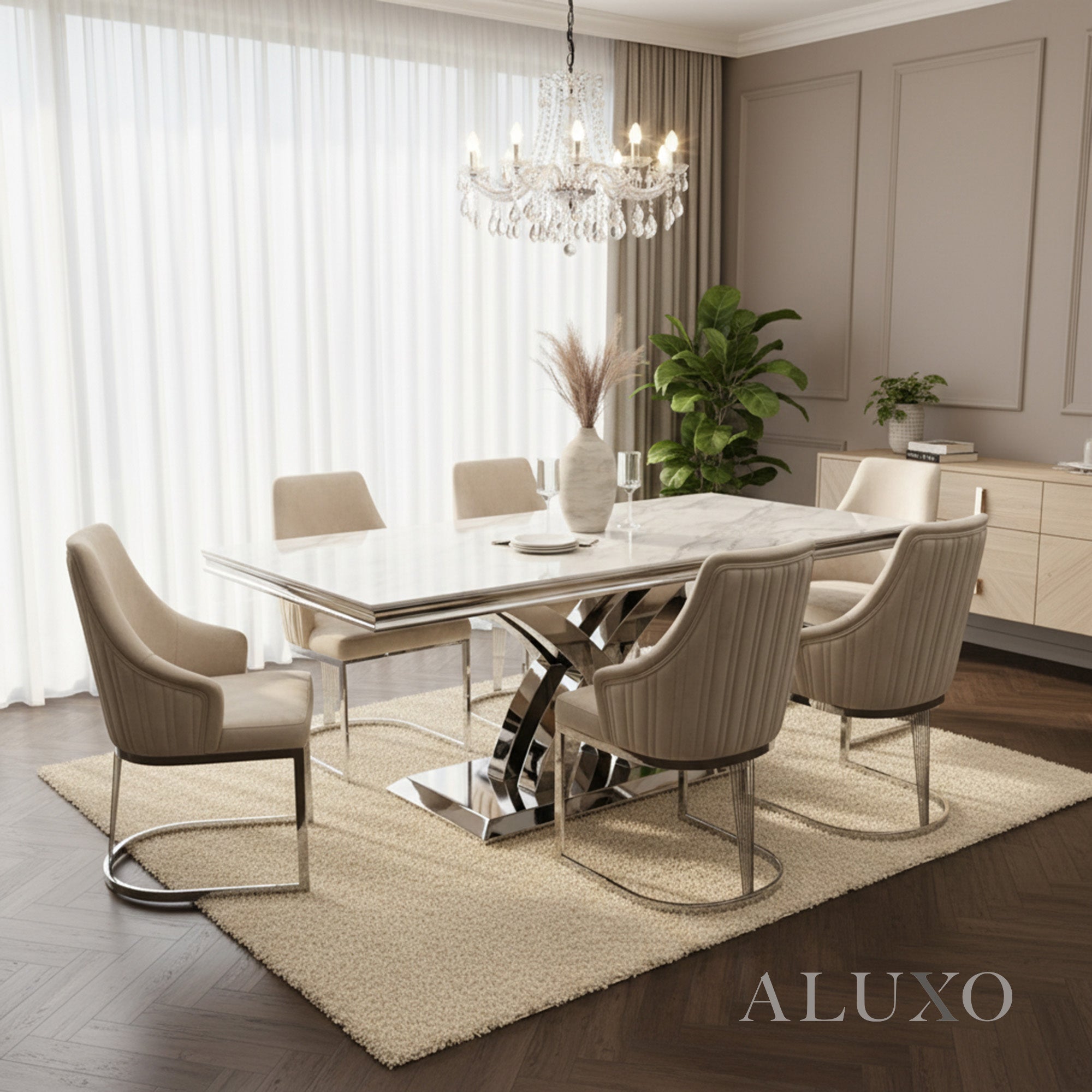 Elevate your dining experience with the Xena 1.8m Rectangular Chrome Dining Set. Featuring a luxurious 15-25mm cream marble tabletop on a distinctive Double X chrome stand, paired with plush Olivia velvet dining chairs with vertical ribbed stitching and silver chrome bases. Each marble pattern is unique, offering a bespoke aesthetic for your home.