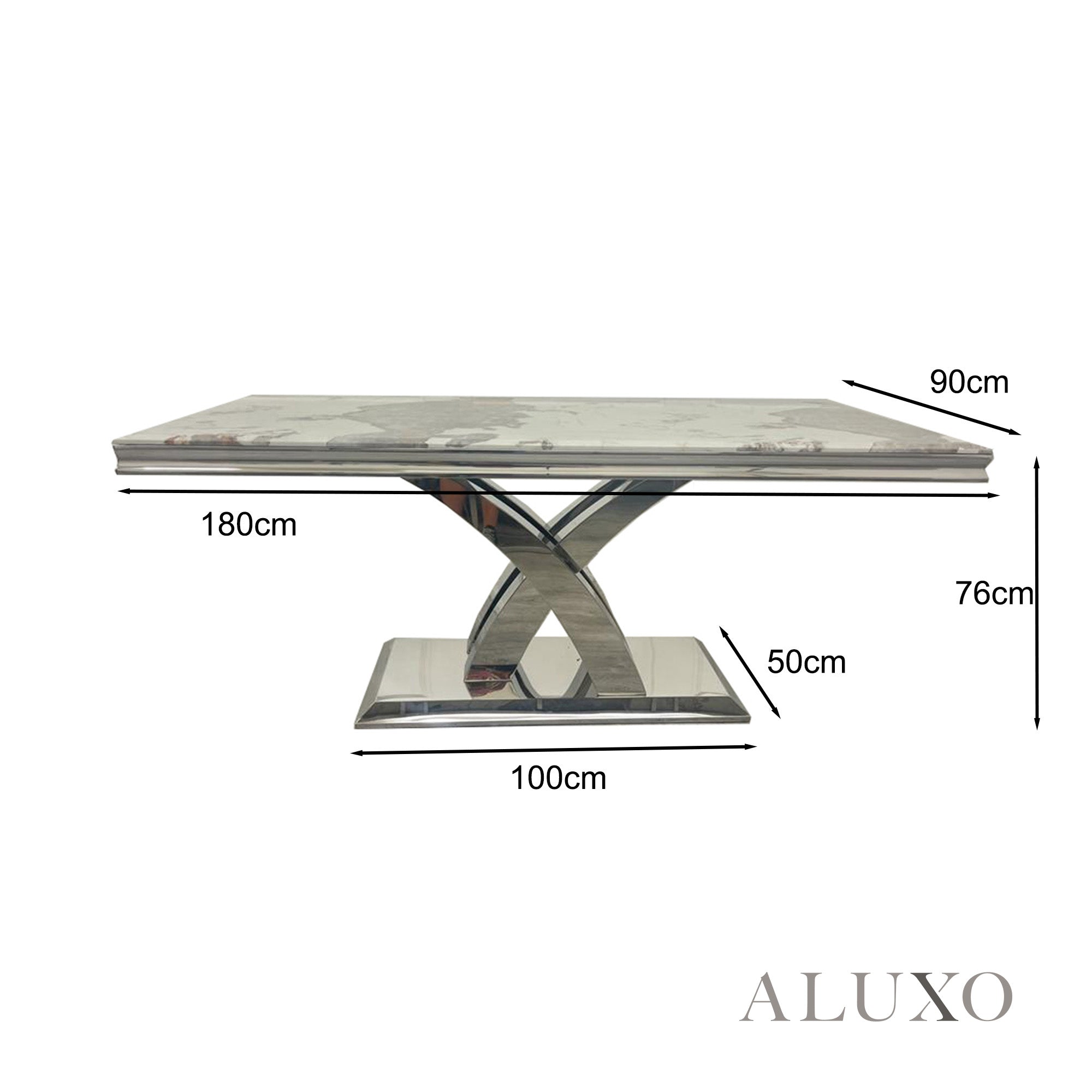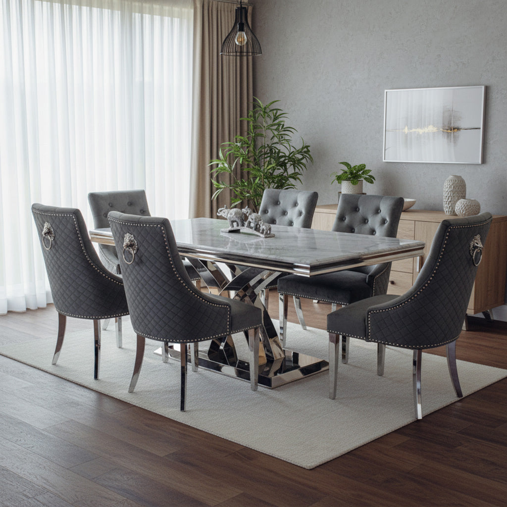 The Xena 1.8m Light Grey Marble Chrome Dining Table Set with Bentley Grey Velvet Chairs combines luxurious marble design with a bold double X chrome base, creating a truly stunning centrepiece for your dining room. Perfect for hosting family dinners or entertaining guests in sophisticated style.Aluxo-Track