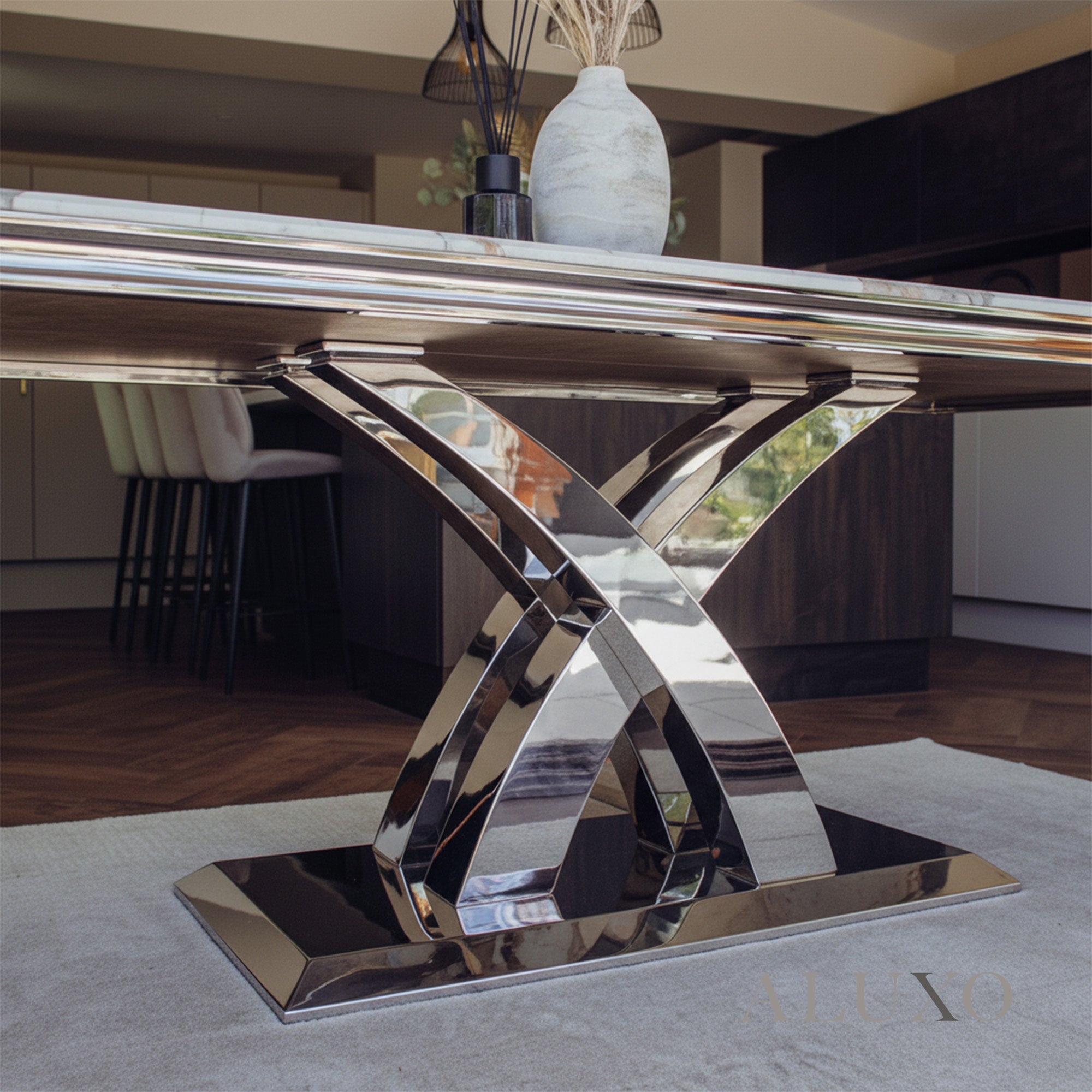 The Xena Dining Table showcases contemporary design with timeless elegance. Featuring a 180cm wide marble-effect surface and iconic Double X chrome legs, it’s the perfect centrepiece for modern dining spaces.