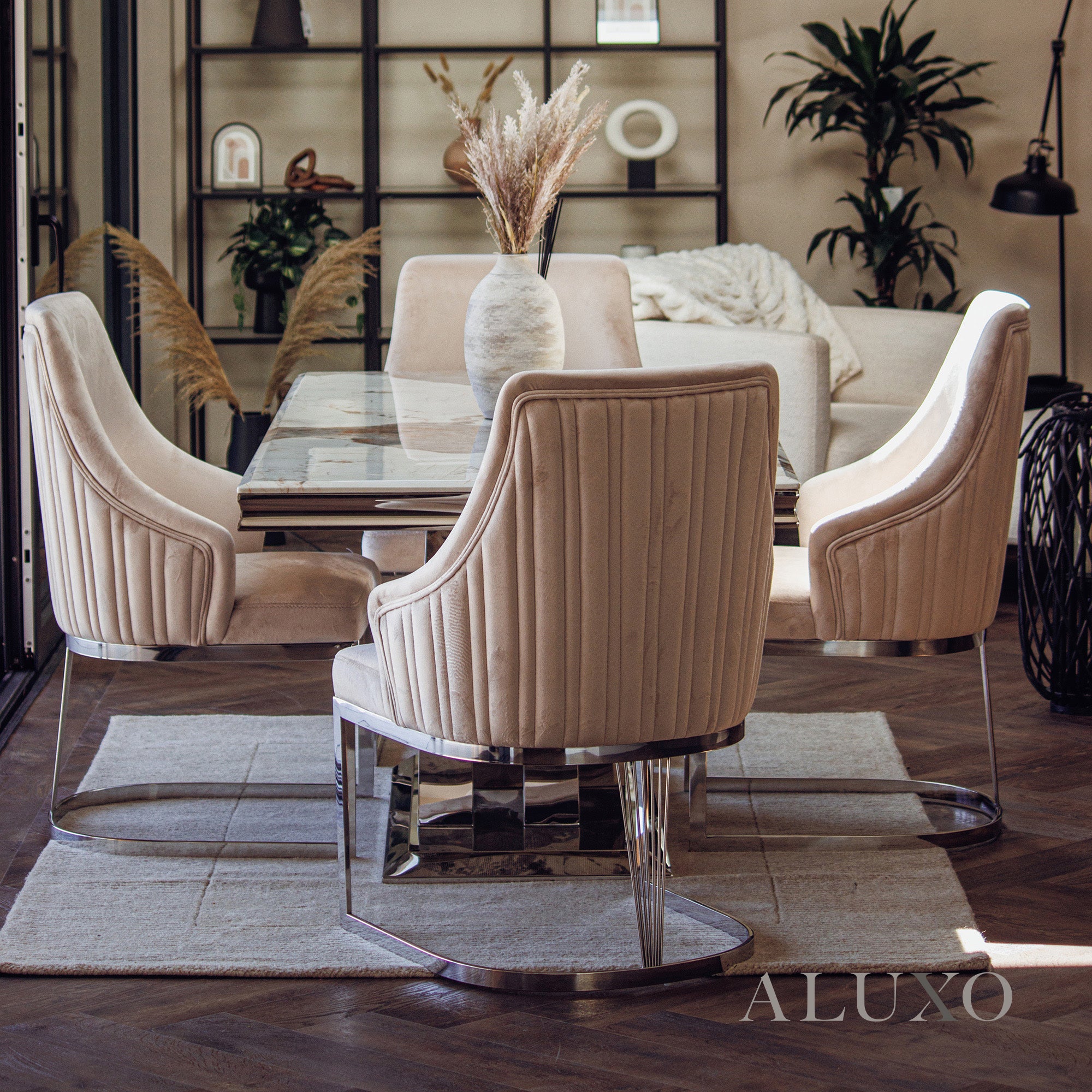 Xena 1.8m Rectangular Chrome Dining Set โ€“ Cream Marble Table with 4/6 Olivia Velvet Chairs