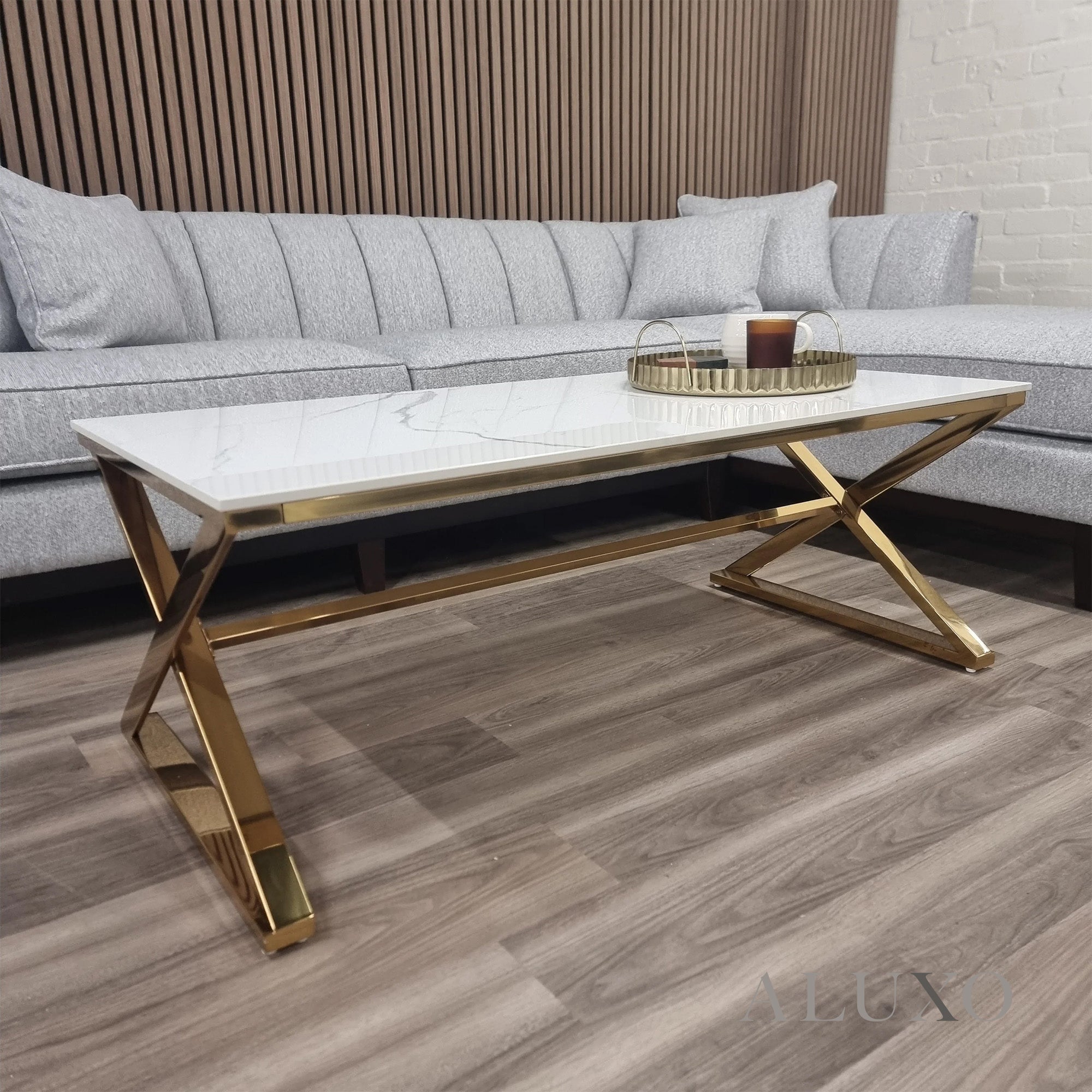 Elevate your living room style with the Jiro 120cm Gold Coffee Table, designed with a luxurious gold-finished base and a stunning polar white sintered stone top. Its sculptural silhouette adds a contemporary edge, making it an elegant focal point for any modern home. Aluxo-Track:JiroGold120Sintered